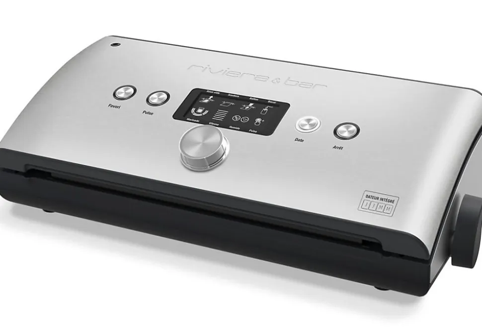 Appareil à emballage sous vide 125w Riviera & Bar – L’appareil à emballage sous vide Riviera & Bar PSV760 avec dateur intégré associe polyvalence et performances.Super pratique pour se rappeler du contenu des sachets mis sous-vide, l?appareil PSV 760 est équipé d?un dateur qui permet de graver la date de mise sous-vide et d?indiquer par une initiale le type d?aliments directement pendant la soudure (système d?autant plus ingénieux qu?il n?utilise pas d?encre?).Avec sa fonction Ballon, chips, gâteaux et autres délices fragiles ne finiront plus à plat ! Car la fonction Ballon vient souffler de l?air dans le sachet et le ferme ensuite par thermo-soudure. Les aliments délicats sont ainsi protégés de l?humidité et des odeurs pendant le stockage comme le transport !L?écran LCD invite à choisir entre les 5 programmes conçus pour une grande variété de préparations? Si les programmes Sous Vide et Soudure sont des fonctions usuelles de cette typologie de produits, les programmes Ballon, Bocal et Marinade élargissent les usages?Il propose 2 niveaux de scellement pour les aliments secs ou humides , 4 vitesses d?aspiration de l?air fonction du type d?aliments dont un mode Pulse manuel (idéal si on souhaite contrôler soi-même l?aspiration de l?air sans utiliser l?un des programmes pré-enregistrés) et un mode Favori pour enregistrer son programme le plus fréquemment utilisé.Il se distingue jusque dans les détails? L?écran LCD et sa molette Easy Select le rendent très intuitif d?utilisation. Esthétique avec sa finition Inox brossé, il intègre également un revêtement anti-trace. Il se verrouille d?une seule main. Le cutter intégré permet de préparer le sachet à la longueur souhaitée.Il est fourni avec de nombreux accessoires additionnels : 1 rouleau de 28 cm x 3 mètres , 10 sacs gaufrés extra-épais (5 sachets de 20 x 29 cm et 5 sachets de 28 x 37 cm) , 1 bouchon sous-vide avec son tuyau d?aspiration pour bouteille de 75 cl et boissons non pétillantes.Entre polyvalence et