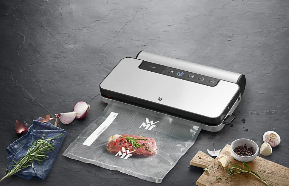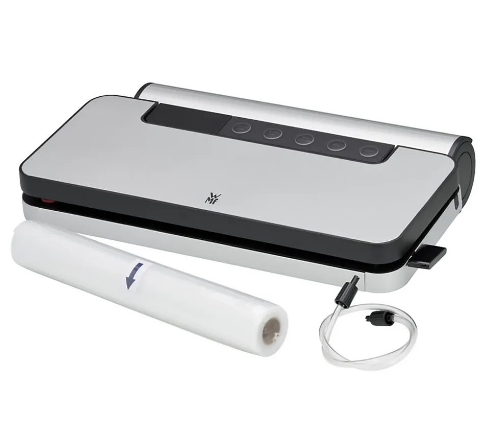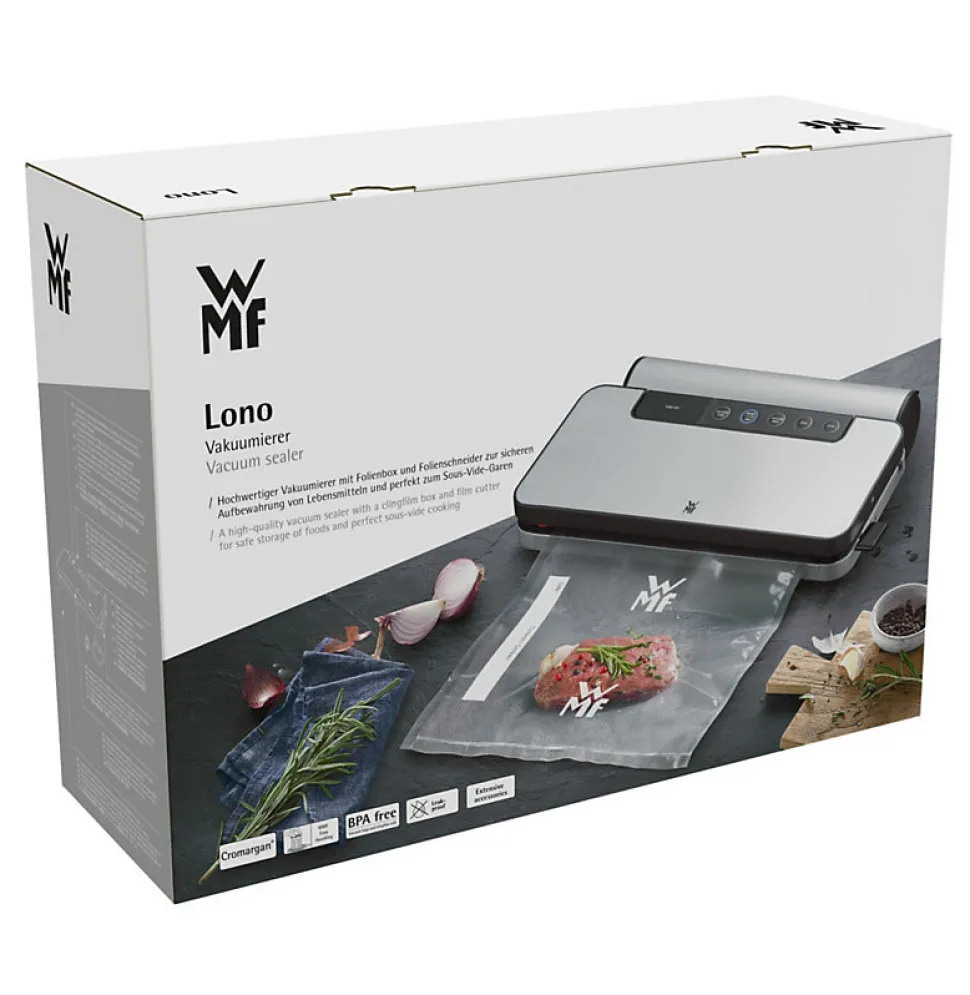 Appareil à emballage sous vide 90w Wmf – L’appareil à emballage sous vide Lono Wmf 0419070011 est une machine sous vide de haute qualité, pour une conservation sûre de vos aliments et une cuisson sous vide parfaite. Soudeuse sous vide pour la conservation des aliments tout en préservant leur saveur. Grande capacité d’aspiration sous vide : 10-12 L par minute. Coupe-film intégré et boîte de rangement amovible pour un rouleau de 6 m maxi. Cinq touches de fonction éclairées : arrêt manuel, emballage sous vide et soudage, réglage aliments secs/aliments marinés, emballage et soudage automatiques. Programme automatique pour aliments humides ou secs. Double soudure pour garantir l’étanchéité. Convient pour des sachets ou films de 30 cm de large maximum. Coupe-film précis et pratique. Facile à nettoyer grâce à son compartiment de mise sous vide amovible. – Type de produit : Soude sac.Matière : Cromargan de haute qualité.Puissance : 90 W.Capacité d’aspiration sous vide : 10-12 L/min.Accessoires inclus : Rouleau de film (30 x 150 cm) et 5 sacs (20 x30 cm) : résistants, neutres en goût tuyau de mise sous vide pour boîtes de conservation.Coloris : Inox.Longueur câble : 1 m.Dimensions appareil (LxlxH) : 17.5 x 41.2 x 8.1 cm.Poids net : 3 kg.
