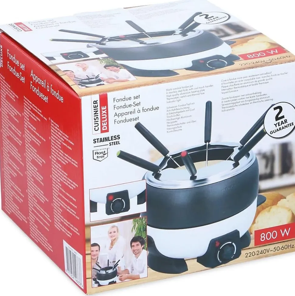 Transformez vos repas en moments conviviaux avec l’ensemble à Fondue Électrique Cuisinier Deluxe, conçu pour des groupes jusqu’à 6 personnes. Caractéristiques clés de l’appareil à fondue Cuisinier Deluxe 800W :- Revêtement antiadhésif : Le caquelon en acier inoxydable noir est équipé d’un revêtement antiadhésif, facilitant le nettoyage et empêchant les aliments de coller.- Fourchettes en acier inoxydable : Les 6 fourchettes incluses, dotées de poignées Cool-Touch, permettent une manipulation sûre et pratique.- Plaque chauffante en aluminium : La plaque chauffante de qualité supérieure en aluminium assure une répartition uniforme de la chaleur pour une fondue parfaite.- Interrupteur Thermique : Réglez la température avec précision grâce à l’interrupteur thermique, offrant un ajustement optimal en fonction du contenu de la fondue.- L’indicateur de taille sur le caquelon va de 0,8 litre à 2 litres, offrant une visibilité claire sur le niveau de remplissage. L’interrupteur thermostatique vous permet de contrôler la chaleur selon vos préférences.Types de Fondues possibles avec cet appareil à fondue électrique :- Fondue à la viande ou à l’huile, fondue bourguignonne : Parfait pour cuire légumes, viandes et poissons dans de l’huile.- Fondue au fromage, fondue savoyarde : Trempez du pain, dans une délicieuse fondue au fromage.- Fondue chinoise: Un voyage culinaire où vous pouvez plonger des fines tranches de viande dans un bouillon parfumé, une option légère et saine.- Fondue au chocolat: Un dessert exquis où vous pouvez plonger des fruits et des sucreries dans du chocolat fondu.Caractéristiques : – Puissance: 800 Watt- Tension d’alimentation : 230V – 50 Hz- Revêtement antiadhésif- 6 fourchettes à fondue- Capacité : Min. 0,8 litre, Max. 2 litres- Interrupteur thermostatique et fusible t
