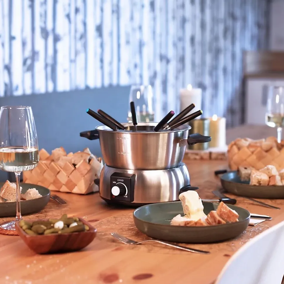 Le DOC263 de Livoo est une fondue électrique de 1000 Watts qui convient à 8 personnes. Le caquelon, de 1.8 litres, est en métal avec revêtement antiadhésif, son thermostat est réglable. Vous pourrez l’utiliser aussi bien pour une fondue bourguignonne, une fondue savoyarde ou pour une délicieuse fondue au chocolat. Le range câble est intégré ce qui vous permettra de ranger le DOC263 aisément dans un placard après utilisation.Caractéristiques- Caquelon en acier inoxydable- Capacité 1,8 L- Thermostat ajustable avec indicateur lumineux de chauffe- Range câble intégré- 8 fourchettes à fondue avec marquage couleur et collerette antiéclaboussures en acier inoxydable incluses- Pieds antidérapant et poignées de transport- Matière Inox- Capacité en litres 1,8 L- Couleur produit Gris- Puissance 1000W- Secteur Oui- Secteur Fiche ronde- Produit Poids : 1.620 Kg- Produit Dimensions (LxlxH) 24.8 x 24.5 x 18 cm…