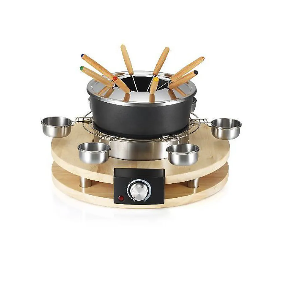 Machine à fondue électrique Kitchen Chef KCWOOD FOND 8 pour 8 personnes. Caquelon antiadhésif 2,7L, thermostat réglable, 1300W, accessoires inclus (8 fourchettes colorées, 6 coupelles, collerette inox). Design stable en bois, entretien facile, compatible lave-vaisselle.