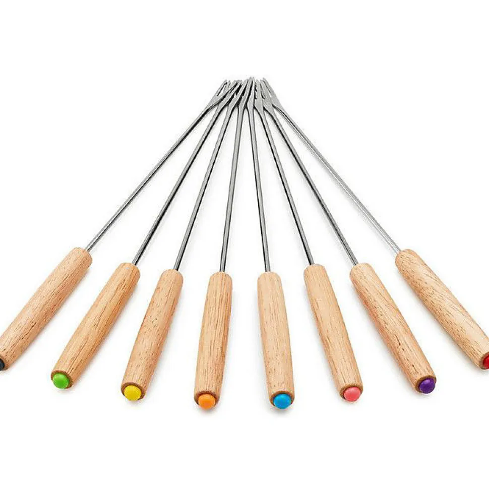 - Équipé de 8 fourchettes avec manches en bois clair et support en thermoplastique.