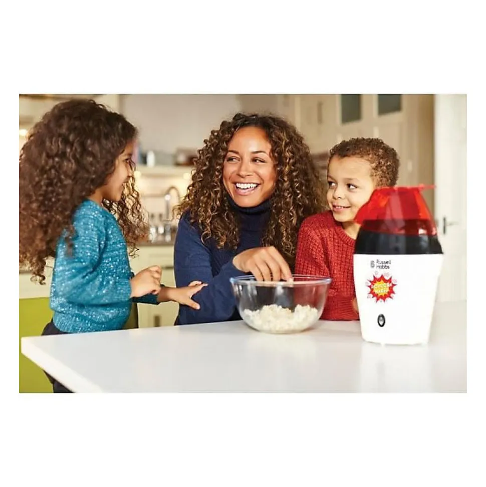 Machine à popcorn Russell Hobbs Fiesta 1200W, grande capacité jusqu’à 12 tasses, utilisation sans huile, design blanc compact, facile à nettoyer, sûre et ergonomique.