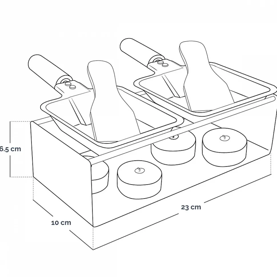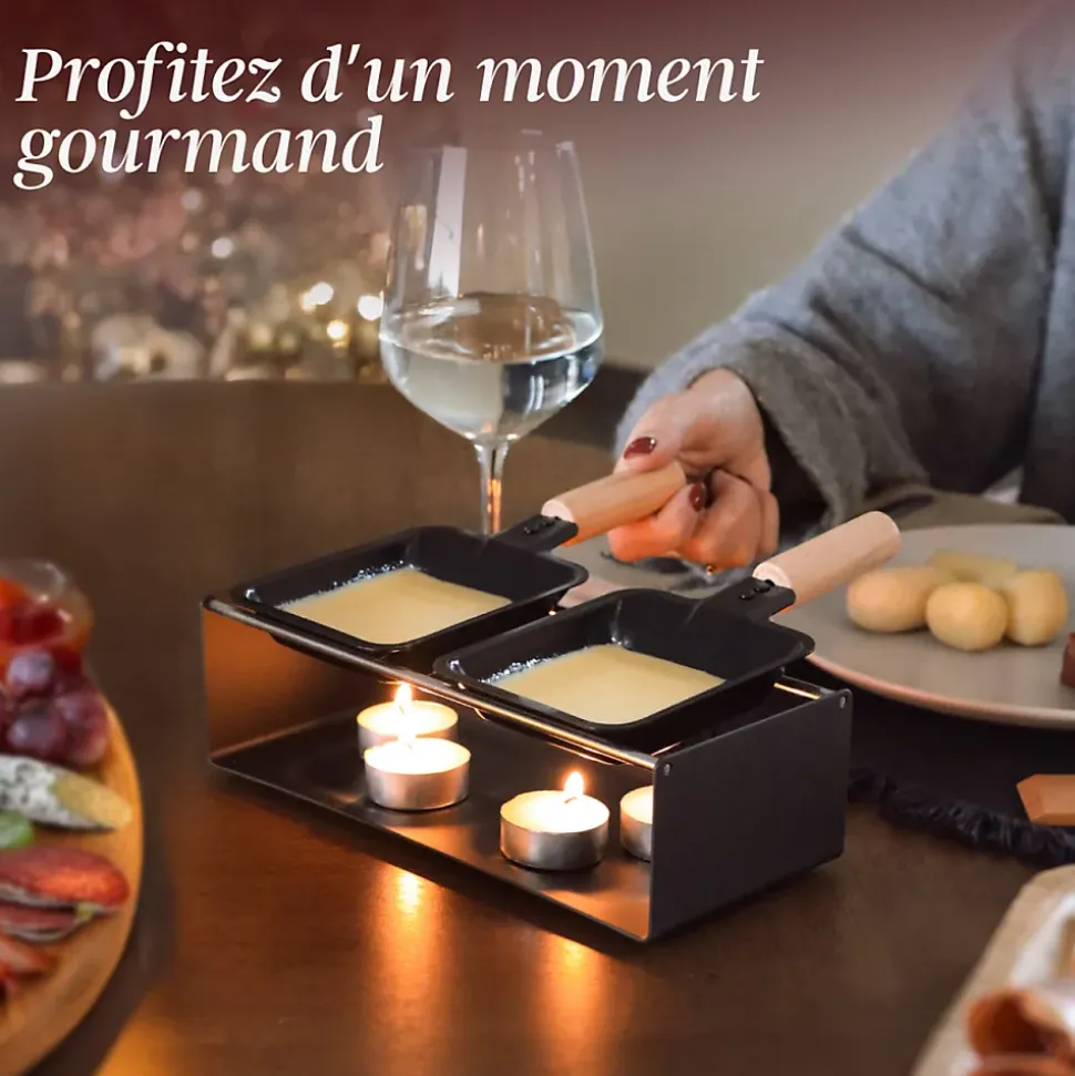 Ce kit de raclette à la bougie, de la marque Linxor, est destiné à une utilisation en duo. Il vous accompagnera pour déguster votre fromage fondu lors d’un savoureux et chaleureux moment à partager.Très pratique et peu encombrant, il est facile à utiliser. Vous pouvez transporter votre raclette partout avec vous. Il vous suffit d’installer vos quatre bougies (incluses, deux par personne) sur la plateforme du bas, de positionner le poêlon sur le dessus et enfin, d’attendre quelques minutes selon vos préférences de cuisson.Fabriquée en métal fer, la structure de votre raclette est légère, solide et stable avec ses patins antidérapants. Deux spatules en bois de hêtre accompagneront votre dégustation afin de ne pas abimer les poêlons. Enfin, les bougies sont en cire végétale.Pour un moment gourmand, le socle accueillant les bougies mesure 23 x 10 x 6.5 cm. Le poêlon, quant à lui, mesure 19.6 x 9.3 cm et la spatule 13.4 x 4 cm. Ce délicieux kit est également disponible pour 2 personnes.Notre ambition est de répondre à vos besoins du quotidien en vous proposant des gammes de plus en plus variées et tendance. Un large éventail de produits est à retrouver à travers nos différentes marques.