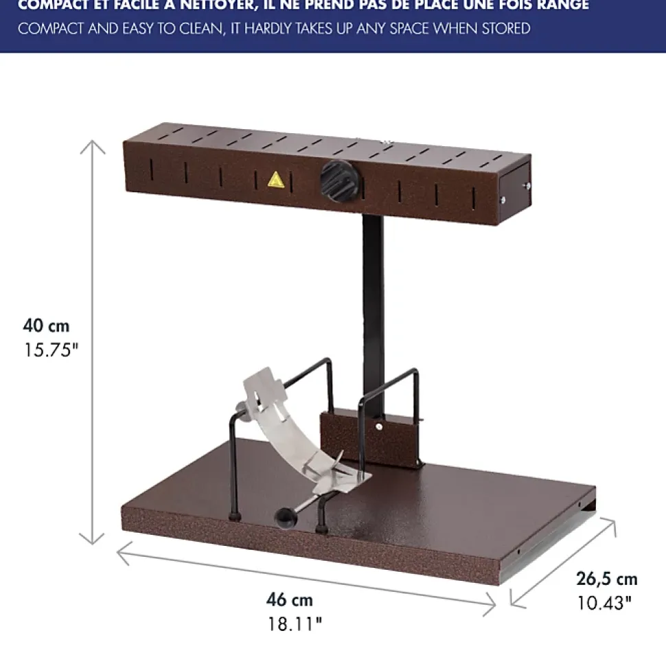 Cet appareil à raclette permet de profiter d’une délicieuse raclette traditionnelle chez vous, en toute convivialité. Vous pouvez ainsi suspendre une portion de meule et de la chauffer en continu, pour un service à la demande. Il convient pour une table de 6 à 8 convives.La rampe de chauffe horizontale se règle en hauteur par crémaillère grâce au bouton de manœuvre pour s’adapter à la taille de fromage choisie et se rapprocher au fur et à mesure que la portion diminue.Fabriqué n en France.Collection : CONVIVIAL Matière : Acier inoxydable (inox) Couleur : Marron Longueur : 46.00 cm Largeur : 27.00 cm Hauteur : 40.00 cm Compatible Lave-vaisselle