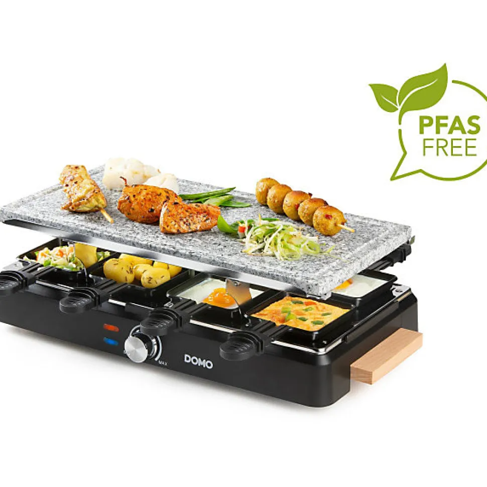 Appareil à raclette multifonction DO9262G pour 8 personnes : pierre naturelle polie et plaque gril antiadhésive sans PFAS, double résistance inox, thermostat réglable, finition noir mat, livré avec 8 poêlons et 8 spatules en bois.
