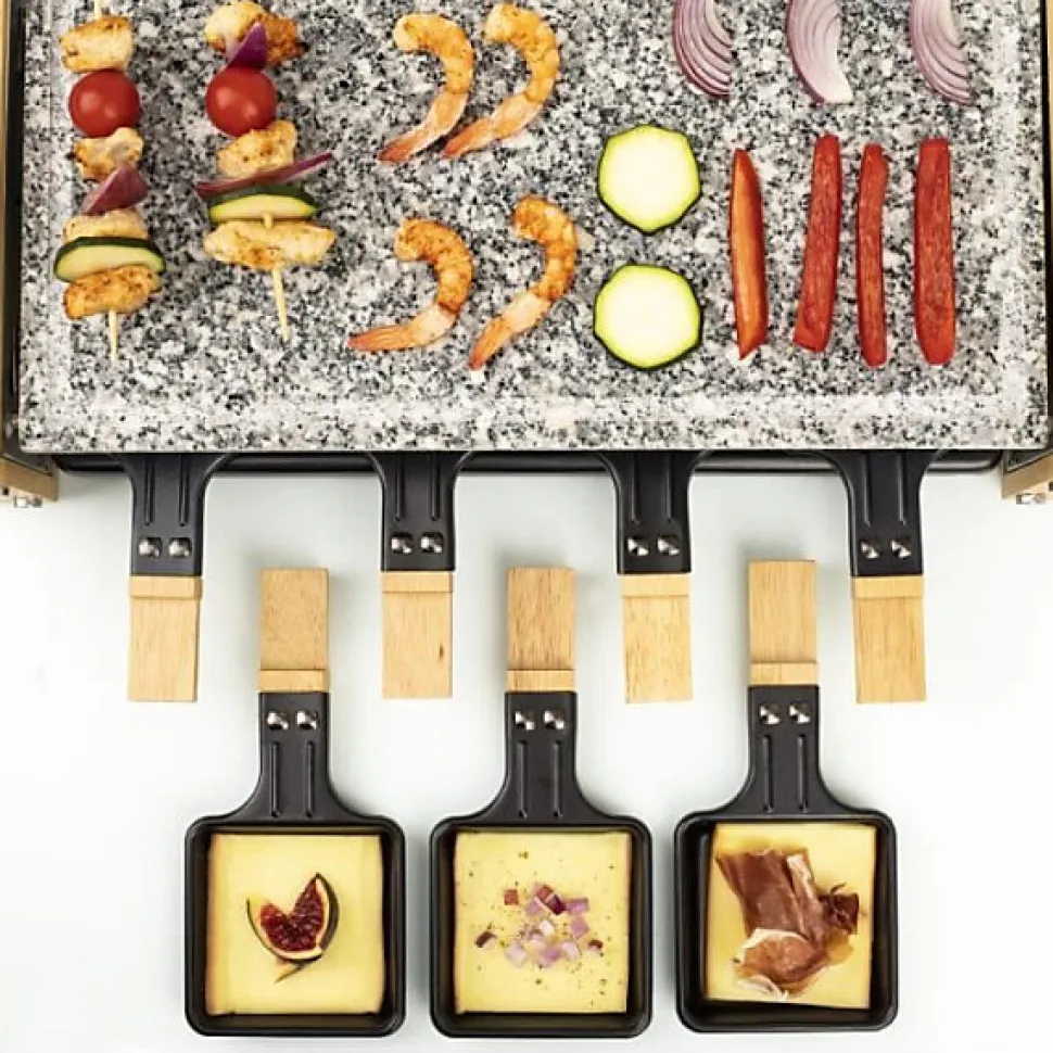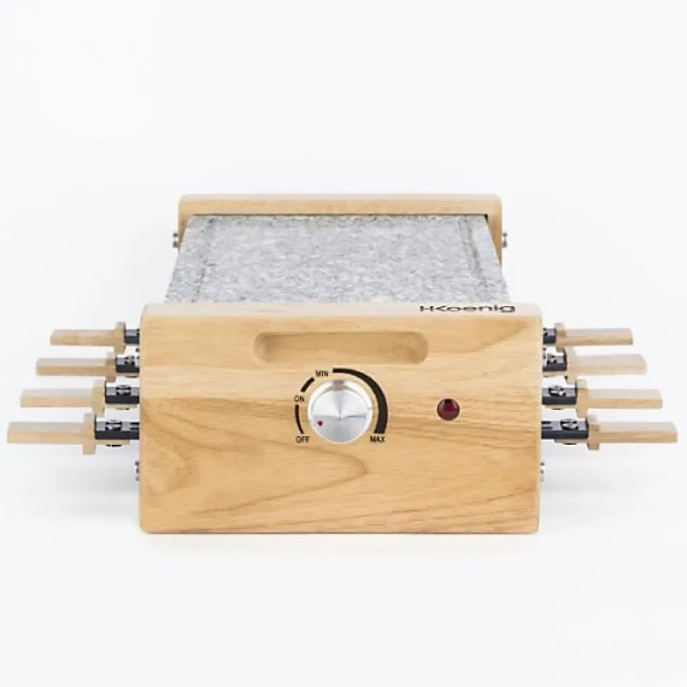 L’appareil a raclette/grill HKoeNIG est idéal pour les repas conviviaux en famille ou entre amis. Avec sa surface de cuisson de 38×19,5 cm, il permet de préparer des raclettes pour 8 personnes. Les poignées en bois naturel offrent une prise en main agréable et la température est réglable grâce au thermostat avec témoin lumineux.