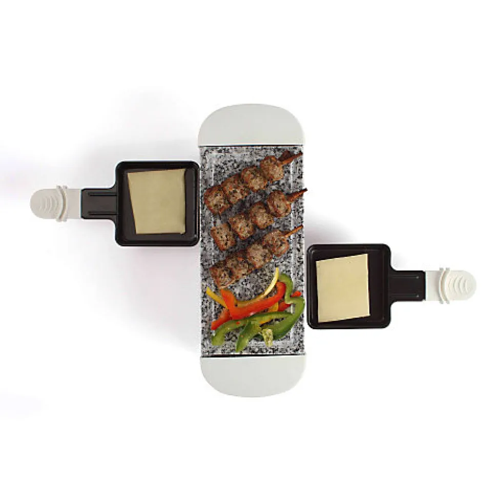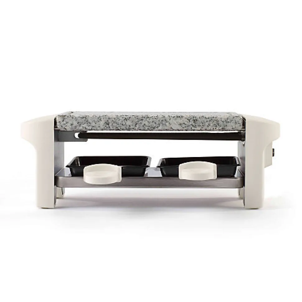 Ping vous propose:Cet appareil à raclette en granit avec finition de couleur blanche.Un appareil 2 en 1 qui fait raclette et pierrade en même temps.Très pratique, un bouton sur le côté, permet de l’allumer ou de l’éteindre à tout moment.Profitez de cet appareil à raclette pour 2 personnes pour partager les repas conviviaux et chaleureux avec l’un de vos proches.En hiver, vous pourrez déguster et savourer une bonne raclette accompagnée de fromages, pommes de terre et charcuterie.En été, sa plaque de cuisson amovible en granit vous permet de griller vos viandes, fruits de mer, crustacés et légumes.Pour assurer la stabilité, les pieds sont antidérapants.Les points forts du produit:- Surface de cuisson amovible en granite – Raclette pour 2 personnes- 2 caquelons – Boutons on/off sur le côté -pieds antidérapants Caractéristiques:- Puissance: 350W- Dimensions: 27 x 12 x 9,5 cm- Poids brut de l’appareil: 1.5 kg- Matière: plaque en granite et finition de couleur blanche- Secteur: oui -2 caquelons fournis