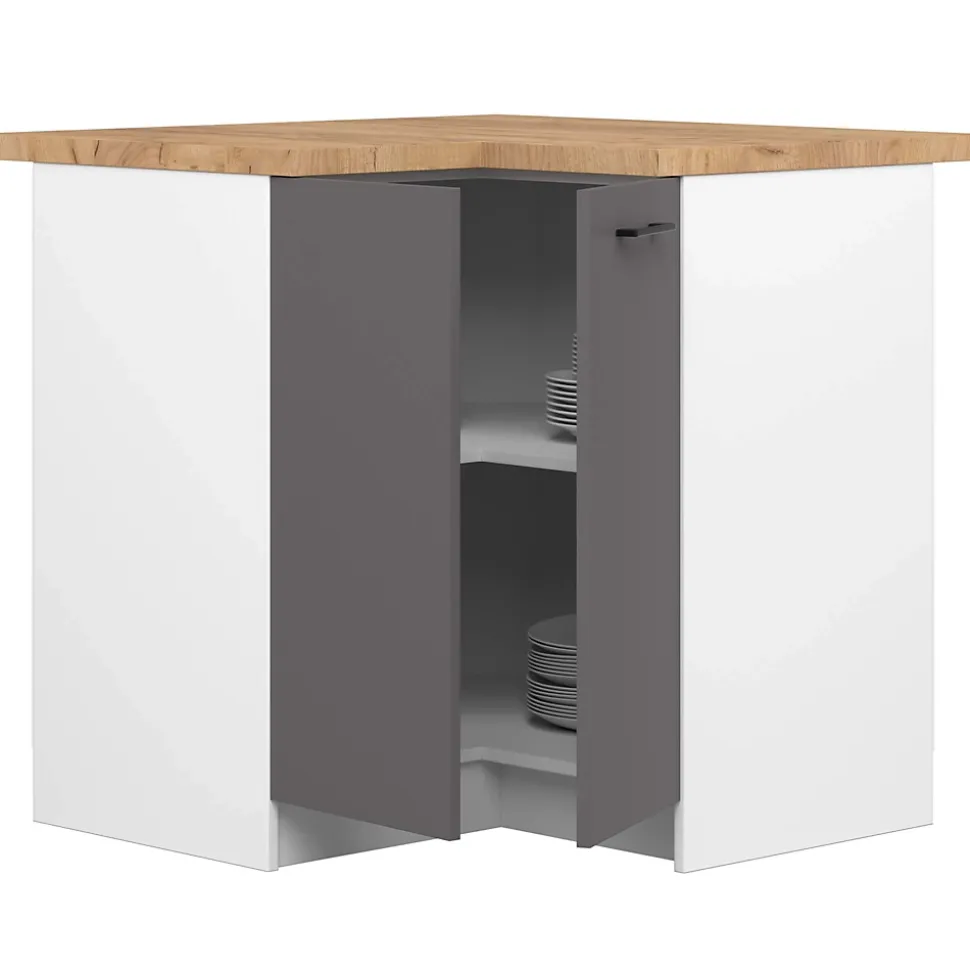 Meuble de cuisine bas AKORD S90 d’angle avec plan de travail OLIWIA Blanc 90 cm 2 portes façade Gris Graphite 2 étagères 90x46x85 cmLa cuisine est la pièce maîtresse de chaque foyer. C’est là que les membres du foyer préparent chaque jour de nombreux repas, discutent et passent du temps ensemble. Il n’est donc pas surprenant que chacun veuille aménager sa cuisine de manière à la fois fonctionnelle et agréable à l’œil. Les meubles de la collection Oliwia y contribueront certainement. Nous aimerions vous présenter l’un des éléments de cet ensemble modulaire – le meuble d’angle S90/90N, conçu dans la couleur blanche à la mode, qui contraste parfaitement avec les poignées noires mates, créant ainsi un ensemble unique. Cet élégant meuble permet d’ouvrir les portes à droite et à gauche, afin d’accéder librement à un grand espace, dans lequel il est possible de placer de nombreux articles nécessaires dans chaque cuisine, des produits d’entretien ou des denrées alimentaires.Le meuble dispose en outre de deux plateaux combinés 30/60 et 84/60 qui forment une unité pour le meuble d’angle.Dimensions: Largeur: 90 cmProfondeur: 46 cmSpécification:Matériau: panneau laminé de l’entreprise KronospanEacute;paisseur du panneau: 16 mmQualité du panneau: Certificat E1 *Bordure: ABS 0,5 mmColour:Caisson : BlancFaçades : Gris GraphiteNombre d’étagères: 2Nombre de portes: 2* Certificat E1, classe d’hygiène E1