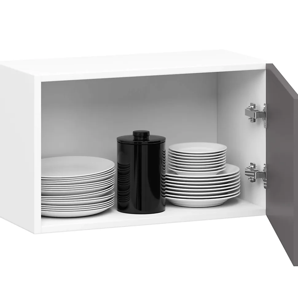 Armoires de cuisine haute AKORD W60 hotte OLIWIA Blanc 60 cm 1 porte couleur Gris Graphite 1 étagère 60x30x29 cmLe meuble de cuisine accrochable au mur OLIWIA est une proposition de la cuisine moderne avec poignées noires. Il offre la simplicité et minimalisme dans le style scandinave. La cuisine suit les dernières tendances en matière de couleurs et offre beaucoup de liberté grâce aux possibilités de construction modulables. Le meuble permet de stocker du café, du thé, des verres et d’autres articles de table. Les armoires de cuisine de la série Oliwia sont une solution bon marché pour aménager l’espace dans la cuisine. Le design classique et le prix bas s’adaptent parfaitement au design intérieur de n’importe quel appartement. Le système se compose de nombreuses armoires pour construire n’importe quelle cuisine.Dimensions: Largeur: 30 cmHauteur: 29 cmProfondeur: 60 cmSpécification:Matériau: panneau laminé de l’entreprise KronospanEacute;paisseur du panneau: 16 mmQualité du panneau: Certificat E1 *Bordure: ABS 0,5 mmColour:Caisson : BlancFaçades : Gris GraphiteNombre de portes: 1Nombre de étageres: 1* Certificat E1, classe d’hygiène E1