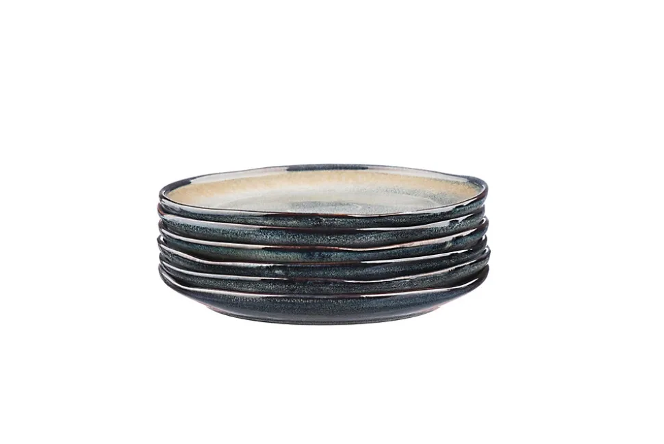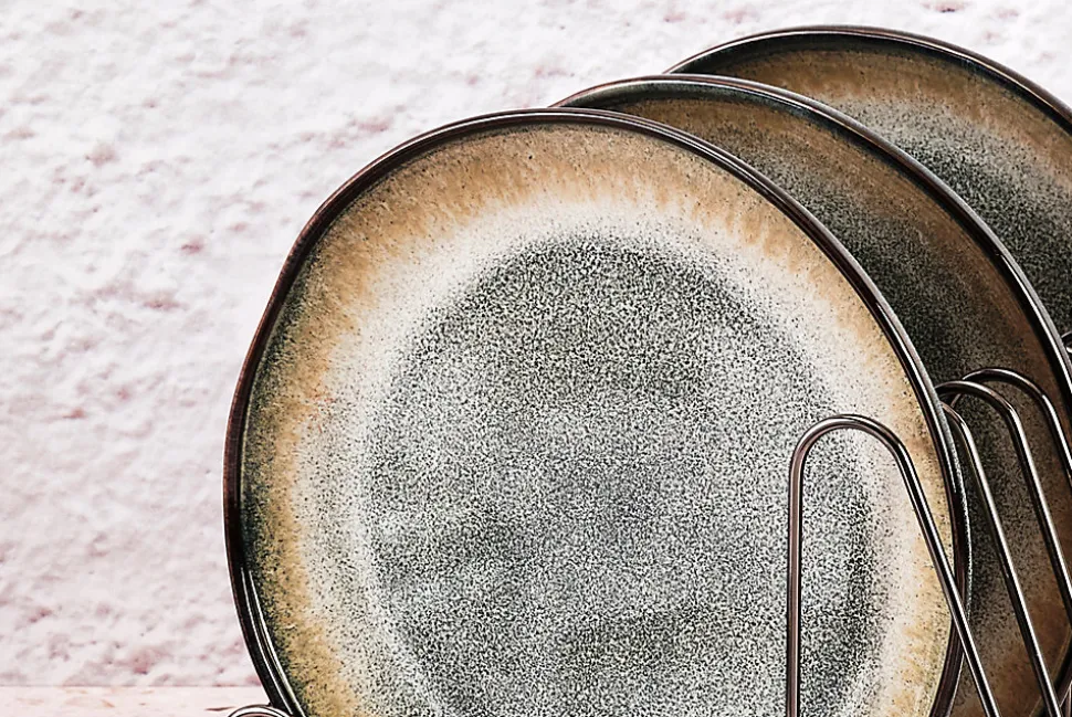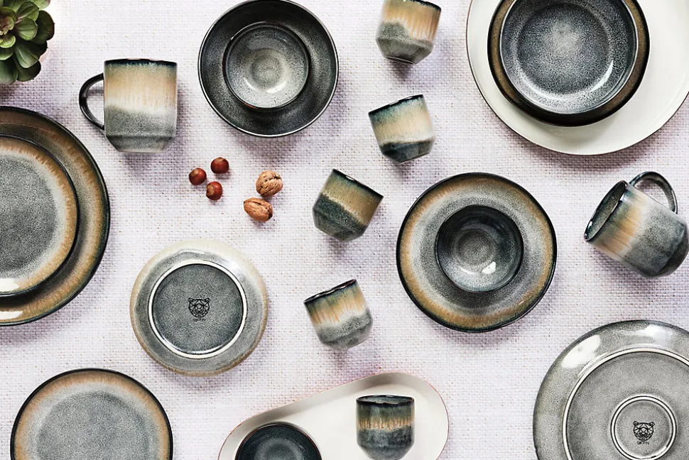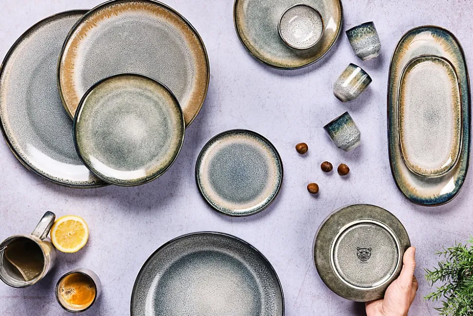 Cette assiette de petite taille est réhaussée en son centre avec des rebords légèrement inclinés. Chaque pièce possède un dégradé de couleur unique et s’armonice parfaitement avec ses semblables.Après une première cuisson de l’argile à basse température, des émaux réactifs de couleurs différentes s’appliquent sur le grès et lui donnent un relief unique et éclatant. L’apparatition de nuances de teintes que l’on retrouve d’une pièce à l’autre est le résultat d’un savant mélange artisanal des techniques de cuisson et du mode d’application de l’émail.La collection GENESIS est inspirée de voyages entre terre et mer. Dans sa déclinaison TERRE apparaît un dégradé bleu gris kaki qui rappelle les couches terrestres. Ses lignes asymétriques et ses coupes franches lui donnent du caractère et de l’authenticité.