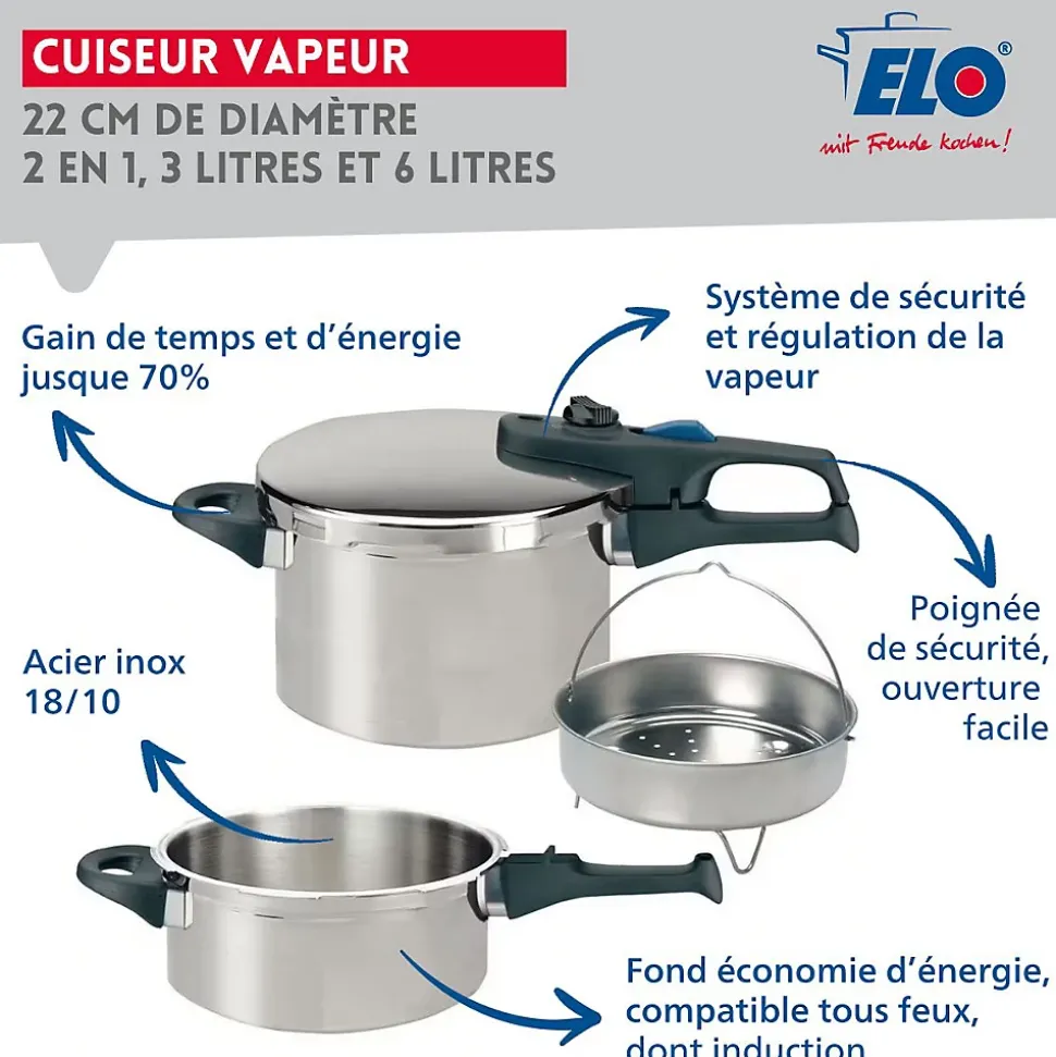 - DESCRIPTION : Autocuiseur vapeur ELO Praktika Plus XL 22 cm deux en un, en acier inoxydable 18/10, 3L et 6L, tous types de feux dont induction