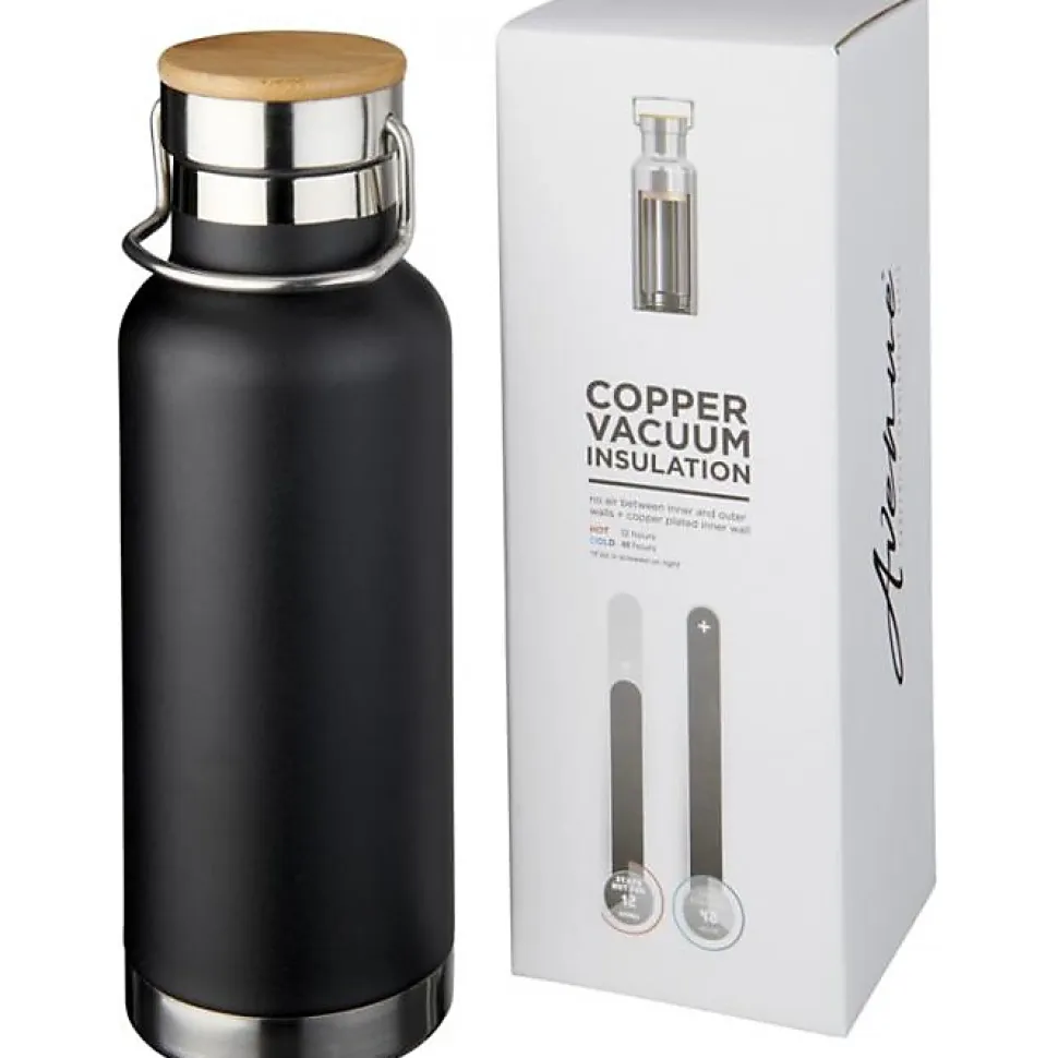 Matériau : Acier inoxydable. Bouteille à boissons à double paroi. L’isolation en cuivre permet de garder les boissons froides pendant 48 heures ou chaudes pendant au moins 12 heures.. La conception empêche également la condensation extérieure. Couvercle à visser avec détail en bois. Revêtement en poudre durable. Capacité : 480ml/16fl oz. Présenté dans une boîte cadeau. Taille : 21 x 7cm.