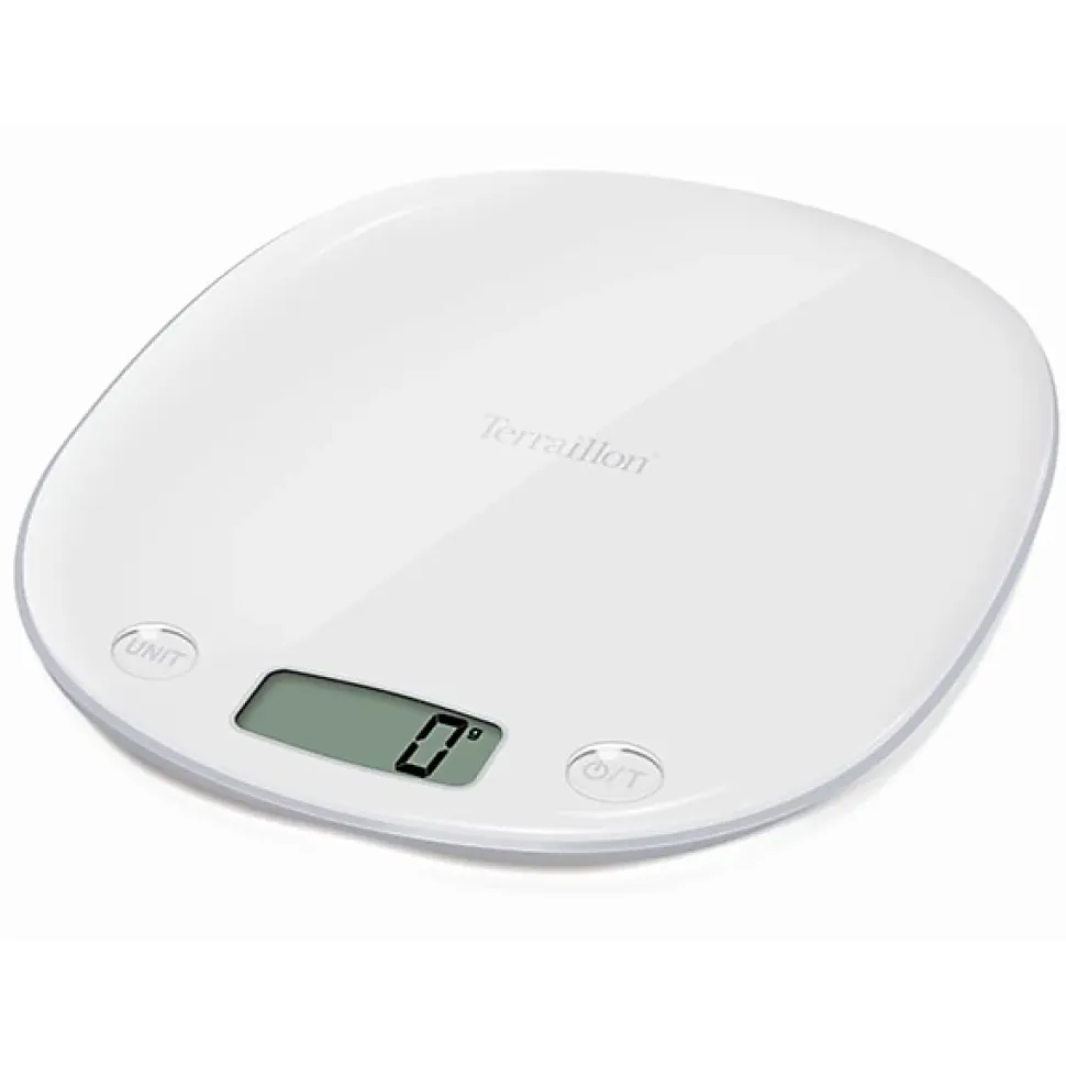 Balance de cuisine électronique Terraillon Macaron finition meringue : compacte et esthétique, capacité 5 kg avec précision 1 g, fonction tare, conversion unités pour solides et liquides (g/ml/lb.oz/fl.oz), écran LCD lisible 51×22 mm, plateforme glossy facile à nettoyer et poignée intégrée pour un rangement pratique. Fonctionne sur 2×AAA. Idéale pour la pâtisserie et l’usage quotidien en cuisine.