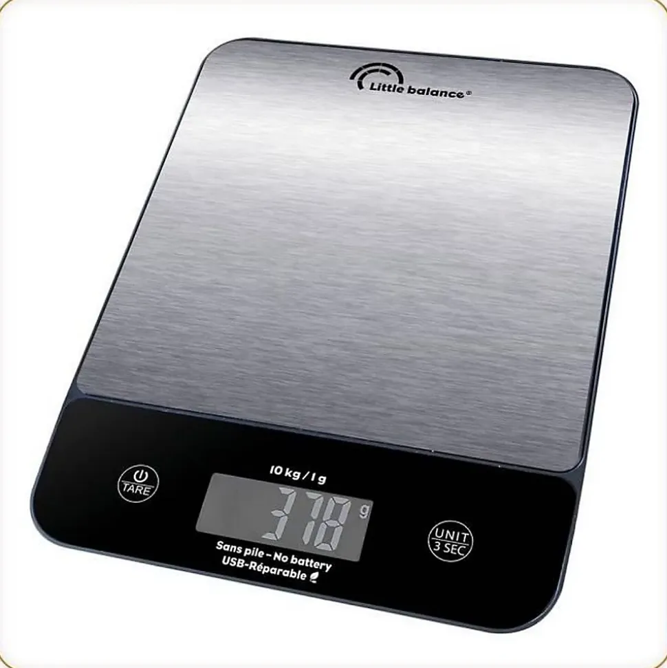 Conception et DesignLa balance de cuisine LITTLE BALANCE 8711 se distingue par son design unique et original, parfaitement adapté à tout décor de cuisine. Le plateau de pesée en inox mesure 180 x 180 mm, offrant une surface pratique pour peser des ingrédients dans de grands récipients. L’écran XXL rétroéclairé sur bandeau incliné anti-reflets permet une lecture facile et précise des poids.Caractéristiques TechniquesCette balance électronique possède une capacité de pesée maximale de 10 kg avec une graduation précise de 1 g. Elle permet le choix entre les unités de mesure en grammes et kilogrammes, ainsi qu’une fonction pour mesurer les liquides. L’alimentation est assurée par une recharge USB, offrant une autonomie de six mois environ après une charge de trois heures.Pratique et Économe en énergieLa balance est conçue pour être économe en énergie et durable. Elle fonctionne sans piles, ce qui réduit les déchets, et est réparable. Après des centaines de chargements, il est possible de remplacer la batterie soi-même, prolongeant ainsi la durée de vie du produit.Utilisation et AvantagesLa balance de cuisine LITTLE BALANCE 8711 est idéale pour les amateurs de cuisine comme pour les professionnels. Elle permet de mesurer avec précision les ingrédients, facilitant ainsi la préparation de recettes. Sa conception robuste et son plateau en inox facilitent le nettoyage et assurent une longue durée de vie.