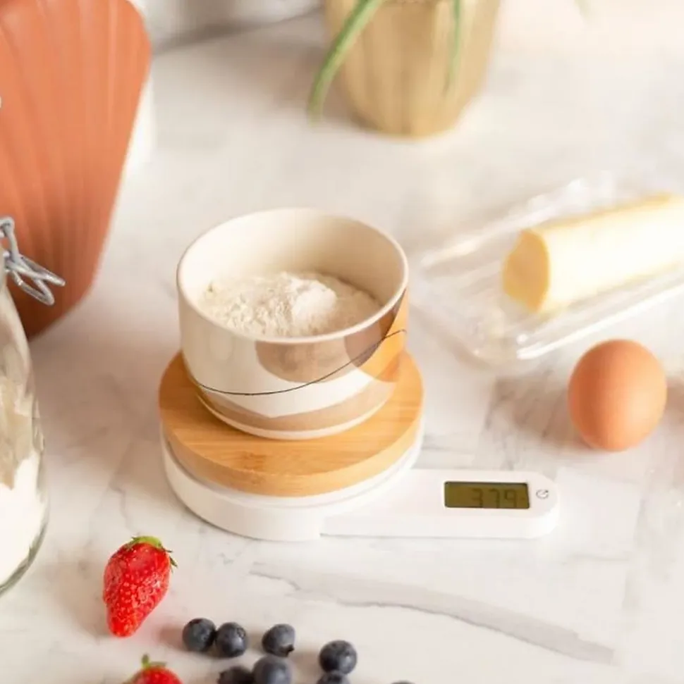 - Capacité 5 kg avec précision 1 g, sélection d’unités (g, lb.oz, ml, fl.oz), fonction tare et arrêt automatique.