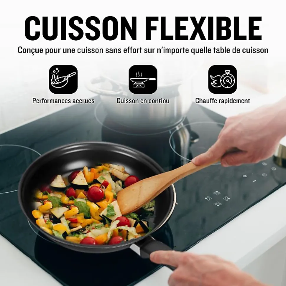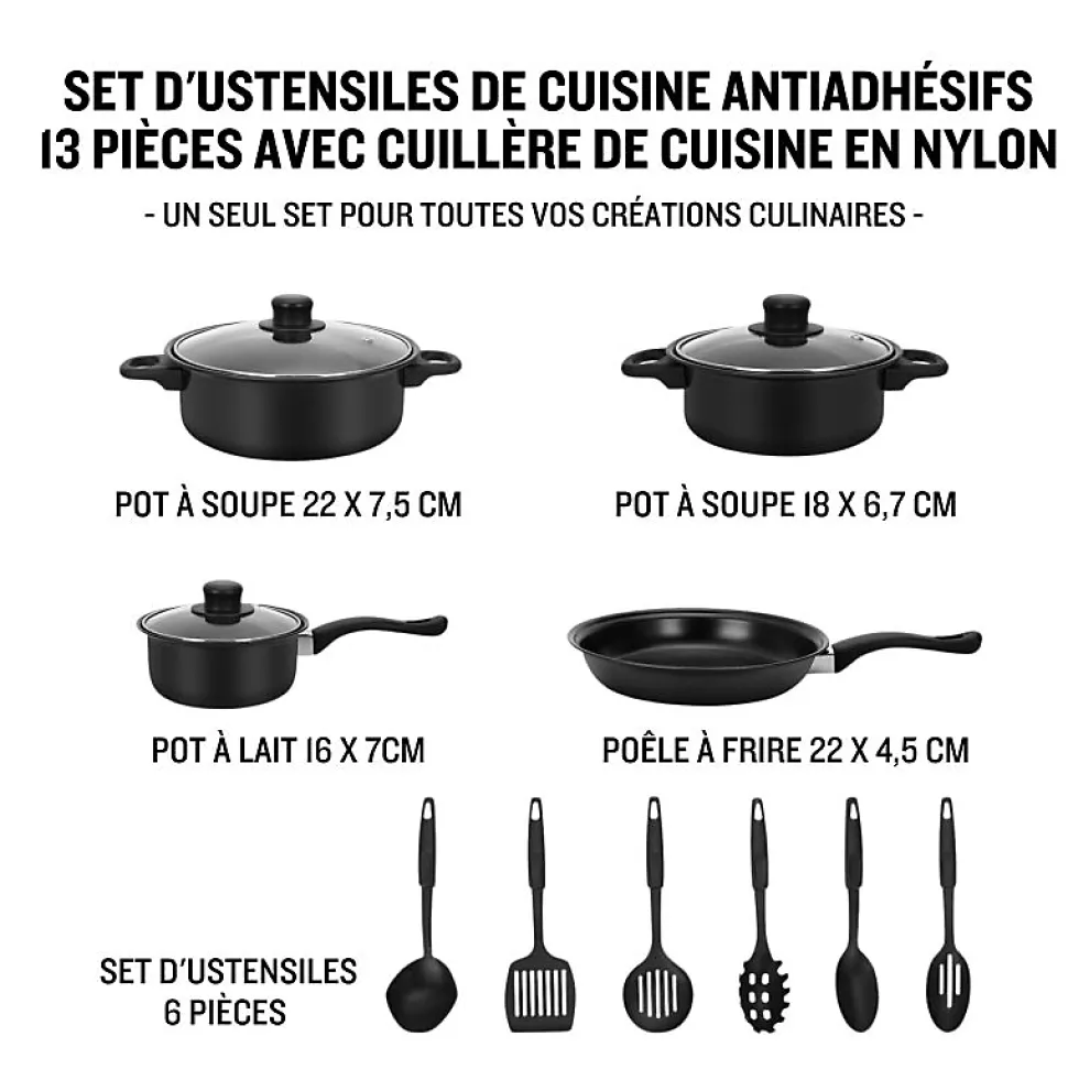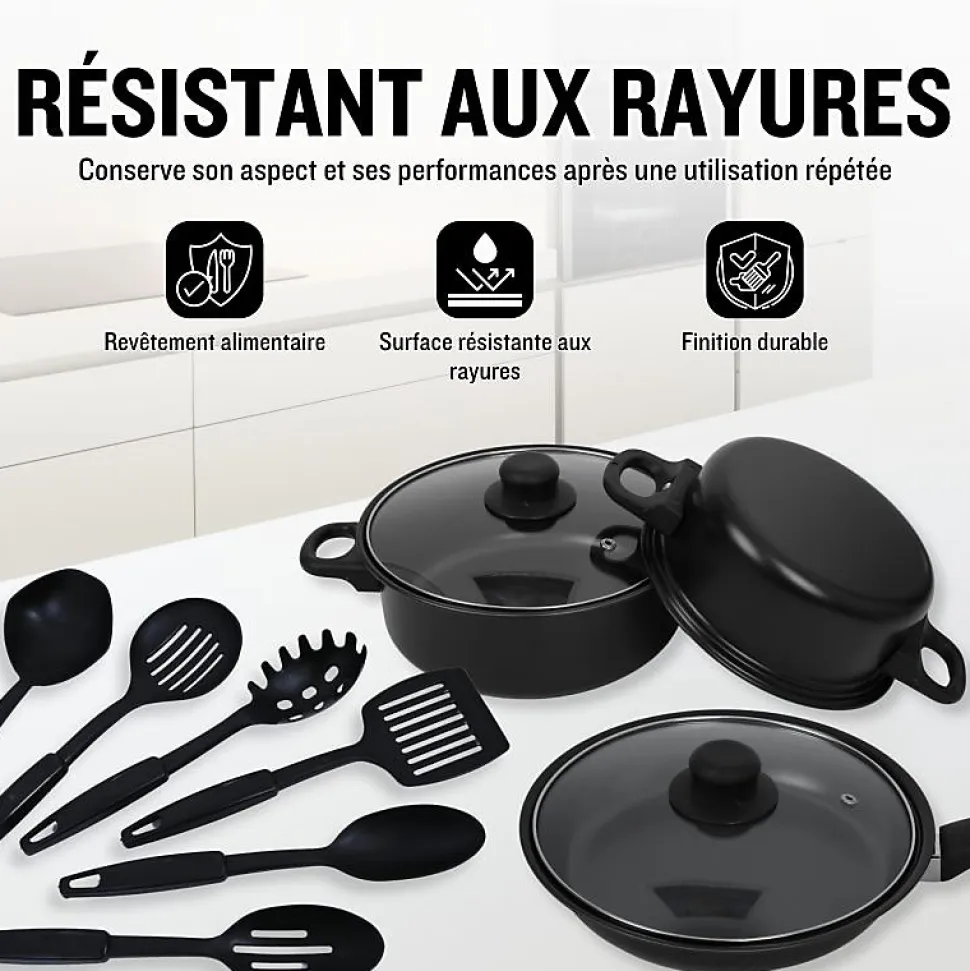 Améliorez votre expérience culinaire avec la batterie de cuisine antiadhésive Herzberg de 13 pièces, comprenant un ensemble de cuillères de cuisine en nylon, conçu pour les chefs débutants et chevronnés. Fabriquées en acier au carbone durable, ces casseroles et poêles conduisent la chaleur rapidement pour une cuisson précise, tandis que le revêtement antiadhésif assure un démoulage sans effort des aliments et un nettoyage facile, réduisant ainsi le besoin d’excès de graisses et d’huiles. L’ensemble comprend des pièces essentielles comme des marmites à soupe, des poêles à frire et des couvercles en verre avec évents de vapeur, offrant une polyvalence pour diverses tâches de cuisson et vous permettant de suivre facilement la progression de vos plats.Doté de poignées douces au toucher pour une manipulation confortable et compatible avec les cuisinières à gaz, électriques, à dessus en verre et à induction, cette batterie de cuisine offre commodité et flexibilité pour tous vos efforts culinaires. Les couvercles en verre trempé permettent une surveillance pratique de vos aliments pendant la cuisson, tandis que la conception lavable au lave-vaisselle garantit un nettoyage sans tracas. Avec sa finition résistante aux rayures et à l’usure, sa construction renforcée et sa finition peinte sûre, cette batterie de cuisine est conçue pour résister à une utilisation quotidienne et maintenir sa qualité au fil du temps. Que vous prépariez un repas rapide en semaine ou que vous prépariez un festin pour vos invités, la batterie de cuisine antiadhésive Herzberg est votre solution idéale pour une cuisine délicieuse et sans effort.Caractéristiques:Construction durable : la batterie de cuisine est fabriquée à partir de matériaux en acier inoxydable et en acier au carbone de haute qualité, garantissant longévité et résistance à la déformation ou à la déformation, même en cas d’utilisation fréquente.Construction à 6 couches :
