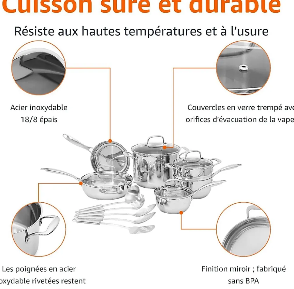 Ce produit est de couleur argentée et fabriqué en acier inoxydable. Sa forme élégante et moderne lui permet de s’intégrer facilement dans divers environnements de cuisine. Ce lot de casseroles et poêles en acier inoxydable offre une cuisson homogène grâce à son cœur en aluminium qui distribue la chaleur rapidement et de manière uniforme. Il est compatible avec les cuisinières à induction, à gaz et électriques, et peut passer au four jusqu’à 260 °C. Les poignées en acier inoxydable rivetées restent fraîches au toucher pendant la cuisson, et les couvercles en verre trempé permettent de surveiller facilement les aliments.