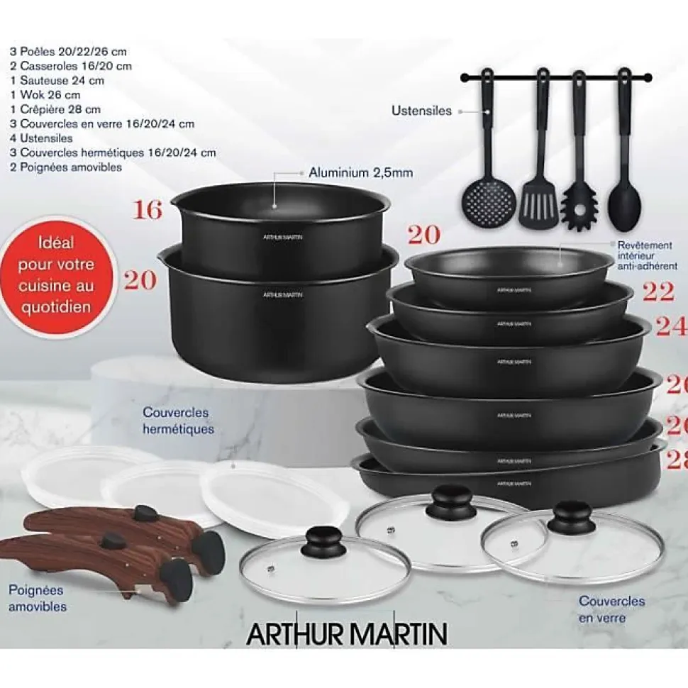 Batterie de cuisine complète Arthur Martin AM0530, 20 pièces en aluminium avec revêtement antiadhésif haute résistance, compatible tous feux dont induction. Design ergonomique avec poignées amovibles effet bois et couvercles en verre trempé hermétiques. Aluminium épais 2,5 mm pour une cuisson homogène. Set complet avec poêles, casseroles, sauteuse, wok, crêpière et ustensiles. Garantie 2 ans.