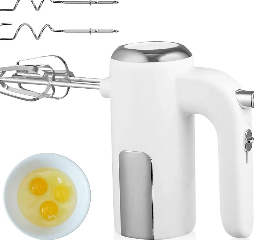 Ce batteur à main puissant de 400 W permet de traiter facilement pâtes, crèmes, blancs en neige et autres préparations. Il dispose de 5 vitesses réglables pour ajuster la force de mélange selon les recettes, du battement léger au pétrissage vigoureux. Livré avec 2 fouets et 2 crochets pétrisseurs en acier inoxydable, il convient au fouettage de crèmes ou blancs d’œufs et au pétrissage de pâte à pain ou à gâteau. Son design ergonomique et compact assure une prise en main confortable et réduit la fatigue lors de l’utilisation. Polyvalent, il est idéal pour gâteaux, pains, pizzas et toutes préparations maison.