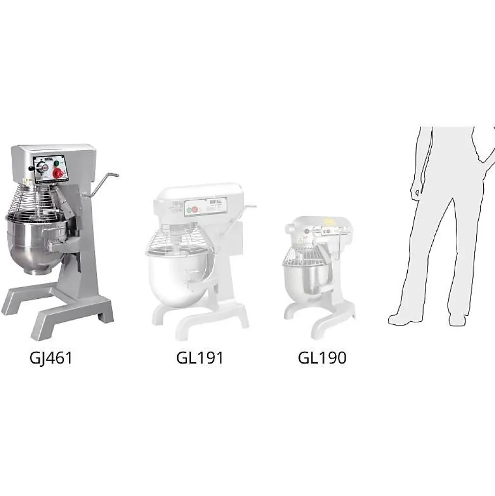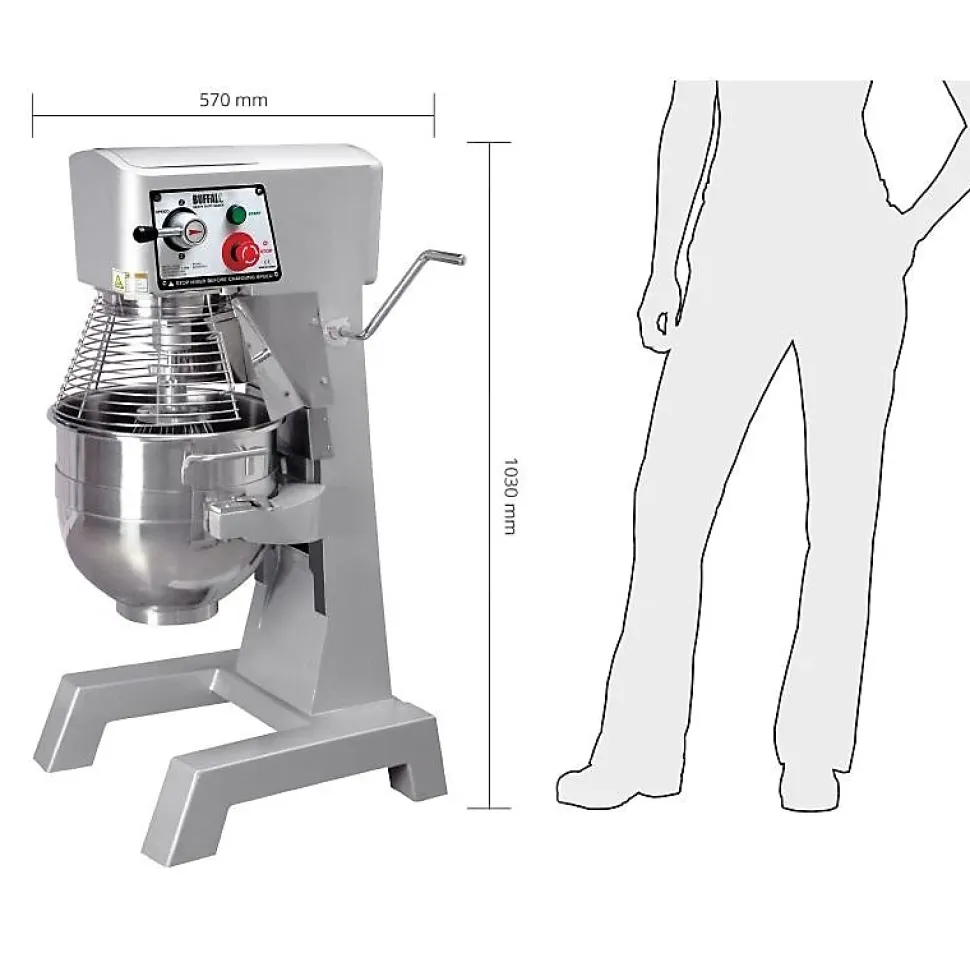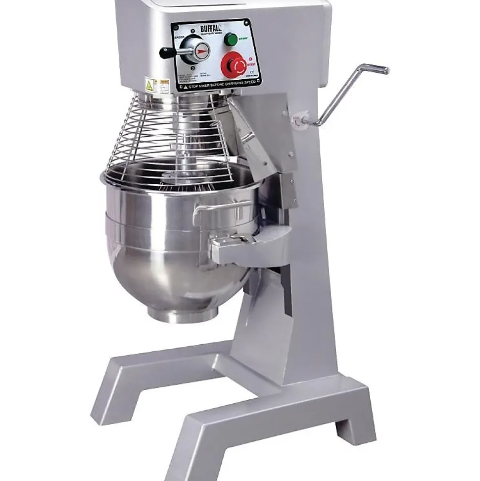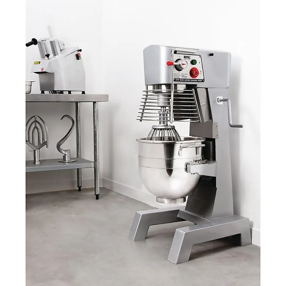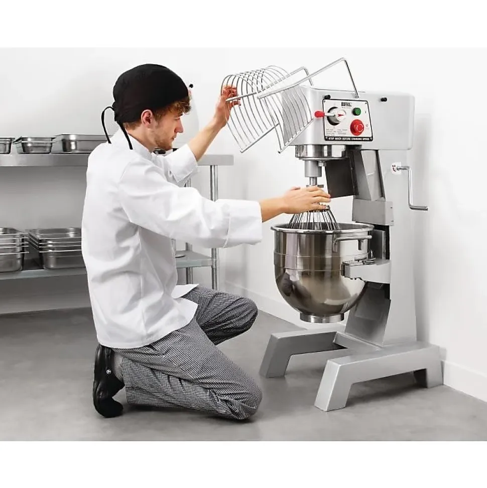 Batteur mélangeur professionnel Appareil non adapté pour les pâtes à pain et pâtes à pizza. Attention bien respecter les capacités indiquées. Capacité maximum de farine 7.5kg et capacité maximum de pâte 11.3kg.Batteur de haute contenance très résistant et fiable, parfait pour les pizzerias, les cantines et les écoles. Structure entièrement métallique durable pour un nettoyage facile. L’arrêt de sécurité s’active si la cuve ou la protection n’est pas correctement en place. Fourni avec un fouet, un crochet à pâte, un batteur plat et cuve inox. Cuve lavable au lave-vaisselle.Vitesses : 1: 90 – 2: 166 – 3 : 282 tr/mnCapacité: 30LDimensions: 1030(H) x 540(L) x 570(P)mmHardwired: ouiPuissance: 1,5kWAlimentation: 230VPoids: 160 kgPuissant moteur commercial de 1,5 kWConstruction robuste, facile à nettoyerCuve en acier inoxydable robuste de 29 litres avec monte et baisse de cuveCommande manuelle simple à bouton-poussoir avec fonction d’arrêt de sécuritéLe batteur planétaire garantit que tous les ingrédients du bol soient mélangésMonté sur support pour la stabilité et une utilisation ergonomiqueFourni avec un fouet, un crochet à pâte, un batteur platCoupe-circuit de sécuritéRéférence soumise à une Eco-participation DEEE de 6,40€ par unité vendue