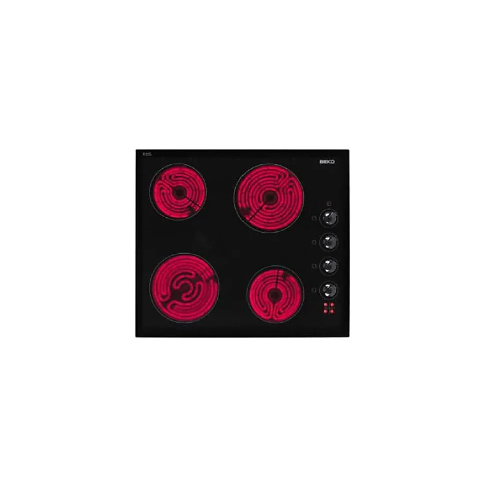 Plaque vitrocéramique BEKO HIC64100 58cm avec 4 foyers indépendants et technologie vitrocéramique pour une cuisson homogène. Verre trempé résistant et système de sécurité intégré. Nettoyage facile grâce à une surface lisse. Commandes latérales par manettes, puissance totale 5800 W.