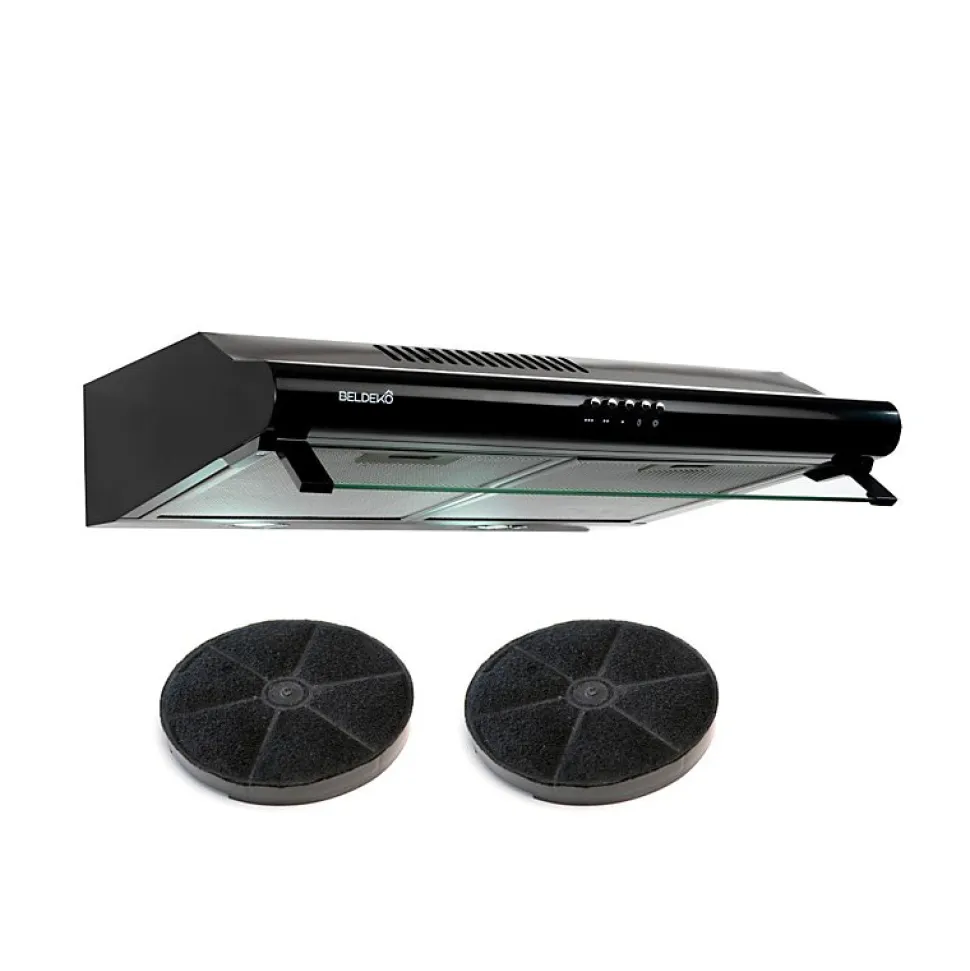 Hotte casquette NOIR 60 cm, moteur de 100W, capacité d’extraction de 240 m³/h, compatible avec l’évacuation extérieure et le recyclage, livrée avec deux filtres à charbon pour un air toujours pur.