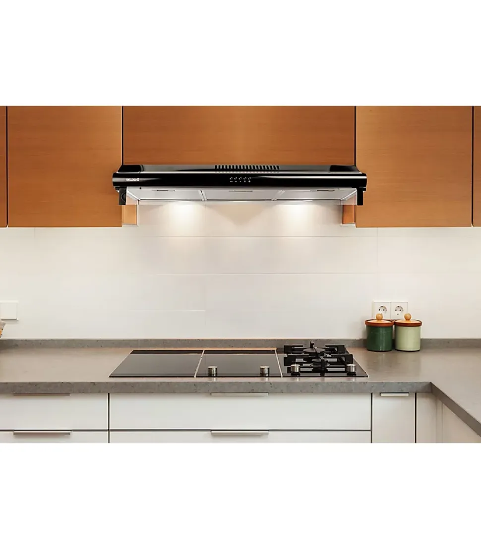 Hotte casquette NOIR 90 cm, double moteur de 200W, capacité d’extraction de 420 m³/h, fonctionnant en évacuation extérieure ou recyclage, idéale pour une cuisine efficace et moderne.
