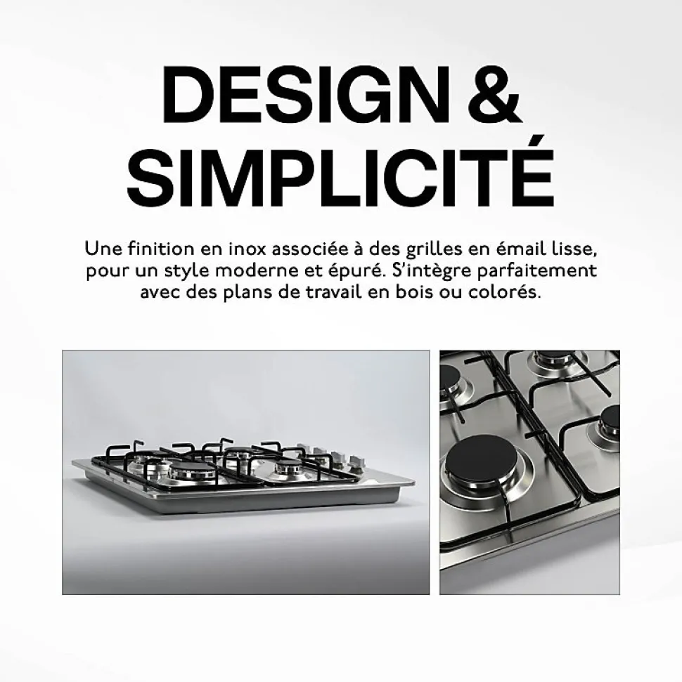 - Matières : Surface : inox – Grilles et chapeaux de brûleurs :émail lisse