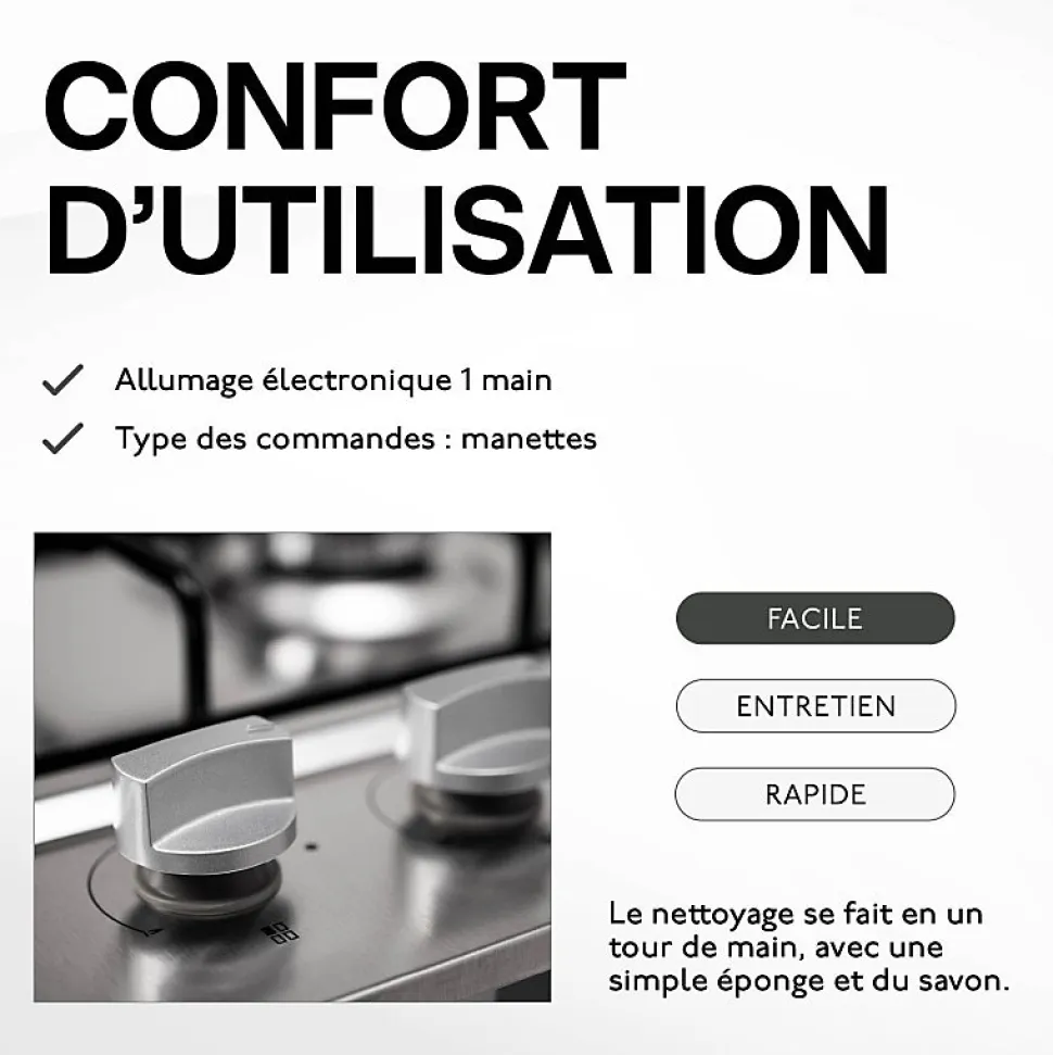 - Type de foyer : Gaz – Nombre de foyer : 4 – Type des commandes : Manettes avec allumage automatique