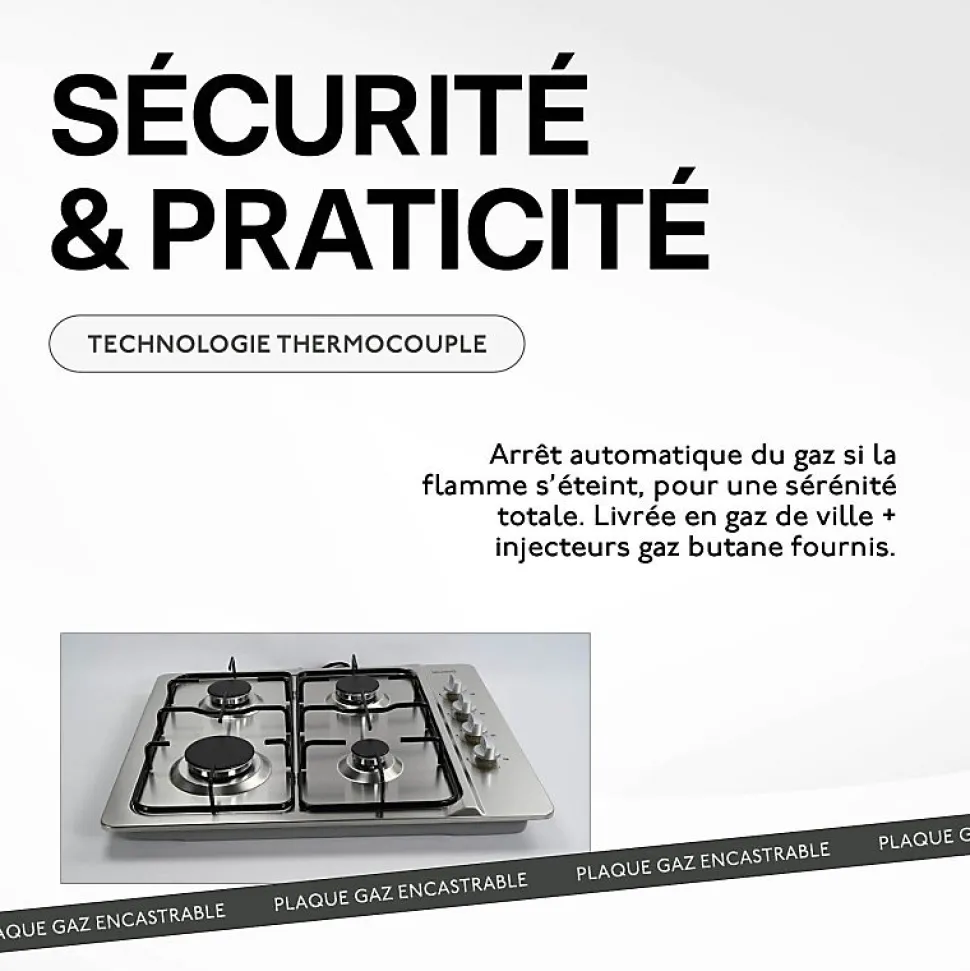 Table de cuisson 4 foyers gaz encastrable en inox