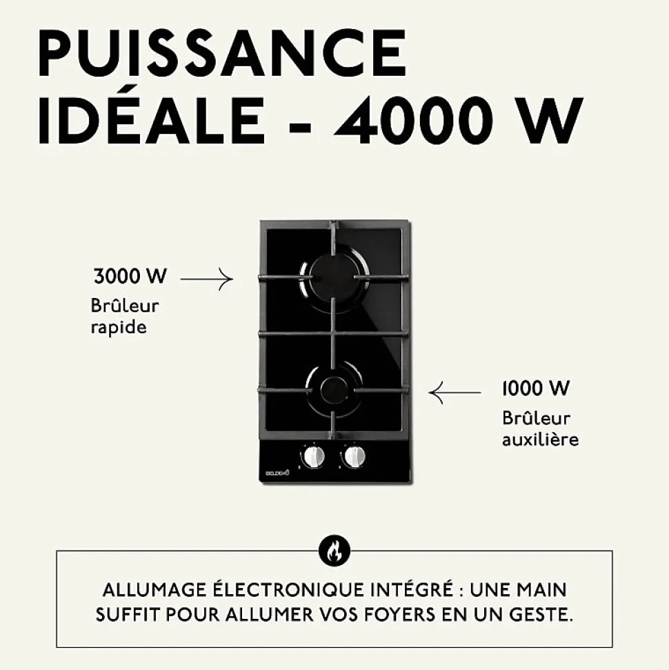 - Puissance : AV brûleur auxiliaire 1000 Watts – AR brûleur rapide 3000 Watts