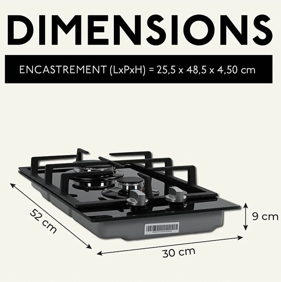 - Dimensions du domino (L x P) : 30 x 52 cm / Dimensions d’encastrement (L x P x H) : 26,2 x 49,2 cm x 4.50 cm / Poids : 6,3 kg