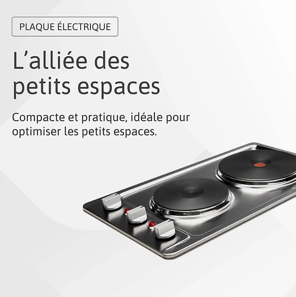 Plaque encastrable 2 foyers, idéale petits espaces : kitchenette, cuisine d’appoint, résidence secondaire, cuisine extérieure ou van. Compacte et pratique, elle s’adapte partout.