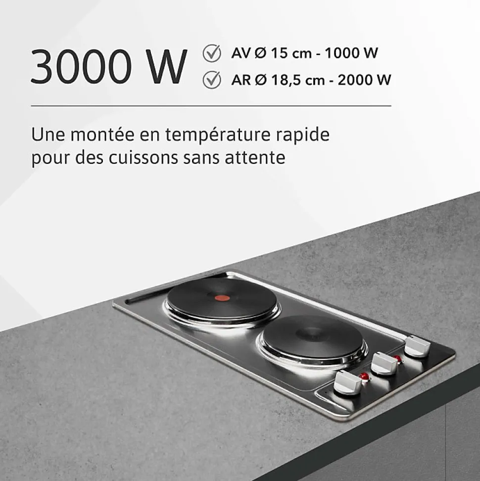 - Puissance : AV Ø 15 cm – 1000 W – AR Ø 18,5 cm – 2000 W / Type de foyer : Electrique / Matière : Inox
