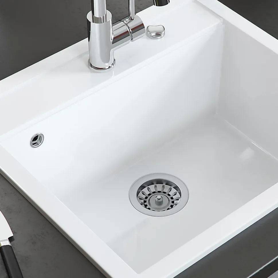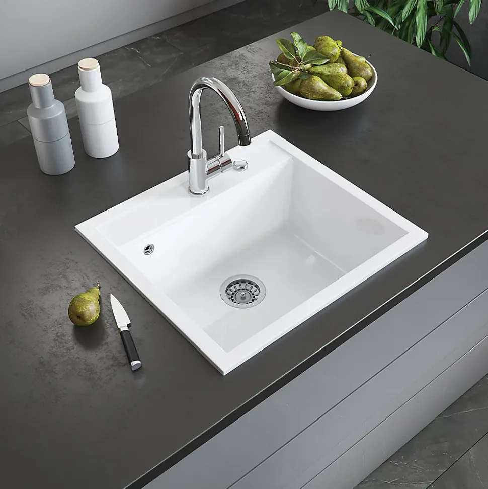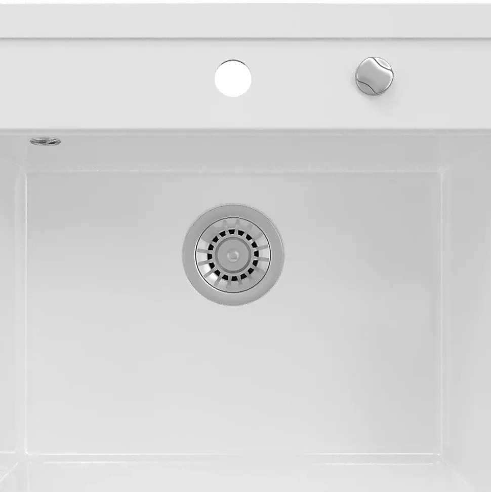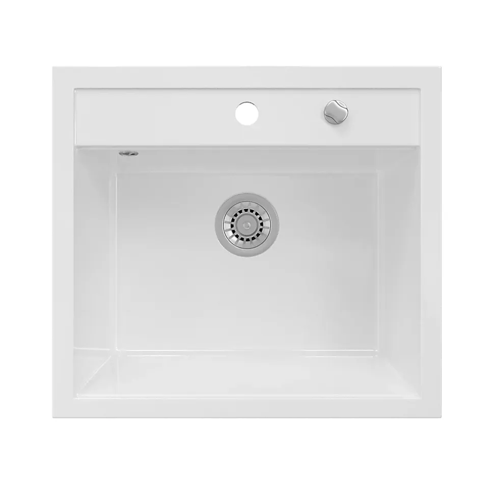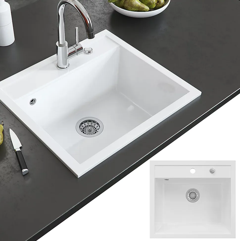 Notre évier avec 80 % de quartz « Valencia » est une bonne décision pour chaque cuisine. Avec son design optimal et le plaisir qu’il procure, il peut être utilisé de manière universelle.L’évier rond blanc est résistant aux rayures et séduit par sa grande résistance aux produits chimiques. Parfait pour chaque ménage !DIMENSIONS : l’évier de cuisine a une largeur de 56,5 cm, une hauteur de 20 cm et une profondeur de 51 cm. Toutes les dimensions détaillées sont indiquées sur les photos.MATÉRIAU : l’évier de cuisine est fabriqué en granit composite, facile à entretenir et robuste.LIVRAISON : évier, instructions de montage, matériel de montage