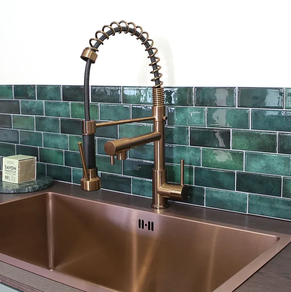 Le ‘Big Pro’ est le mitigeur par excellence. Design moderne et industriel, pratique et complet en version cuivre brossé, doté d’un bec verseur, il sera très utile dans votre cuisine. DESIGN ET QUALITE – Couleur : Cuivre brossé – Produit : Robinet mitigeur évier à douchette mobile (non extractible) – Corps du robinet : Rond en laiton avec barre stabilisatrice de maintien – Bec : Pivotant et bec verseur avec robinet d’arrêt – Barre stabilisatrice de maintien : En laiton – Poignée : En métal – Douchette : Mobile avec monojet – Aérateur anticalcaire : Oui (limite la production de calcaire) – Mécanisme : Cartouche à disques céramique 35 mm – Flexible : Ressort en métal avec flexible tressé – Kit de fixation : Système ESSEFIX (fixation facile sans outil) – Alimentation à l’eau : Lyres tressées inox 35 cm incluses DIMENSIONS – Hauteur totale : 483mm – Hauteur sous bec : 95mm – Largeur sortie d’eau/axe du corps : 222mm – Diamètre embase : 50mm NORMES : – Certification ACS : Accréditation de Conformité Sanitaire. GARANTIE : – Corps garanti 5 ans. – Pièces d’usure (poignée, cartouche, flexibles…) garanties 2 ans. Conseils d’utilisations et d’installation : – Avant de procéder au montage, nous vous conseillons de purger soigneusement les tuyauteries d’eau chaude et d’eau froide pour éviter que les saletés et résidus puissent compromettre le bon fonctionnement de la robinetterie. – Après avoir fermé l’alimentation d’eau principale, démonter l’ancienne robinetterie. – Nettoyez soigneusement le filetage des tubes d’alimentation d’eau principale. – Installer le mitigeur de cuisine dans un trou de 35 mm dans un évier ou plan de travail. – Vérifiez que la longueur du bec est compatible avec votre évier (voir dessin technique) Conseils d’entretien : – Pour garder votre robinet le plus longtemps possible, l’idéal est de le nettoyer tous les jours avec un chiffon humide non abrasif ou une microfibre, terminer en essuyant avec une microfibre ou un chiffon sec. – Ne jamais utiliser de