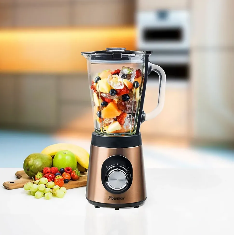 Blender 1.5l 500w cuivre Bestron – Le blender ABL500CO de Bestron dispose d’un design élégant cuivré. – BlenderCapacité : 1.5 LBol en verre amovible, compatible lave-vaisselleCouvercle de sécurité marche/arrêtOrifice de remplissage pratique2 vitesses + position pulse4 lames en inox amovibles, aussi pour glace piléeFacile à nettoyerPieds antidérapantsDimensions : 15,5 x 17 x 39 cmPoids : 2.85 kgCouleur : cuivre