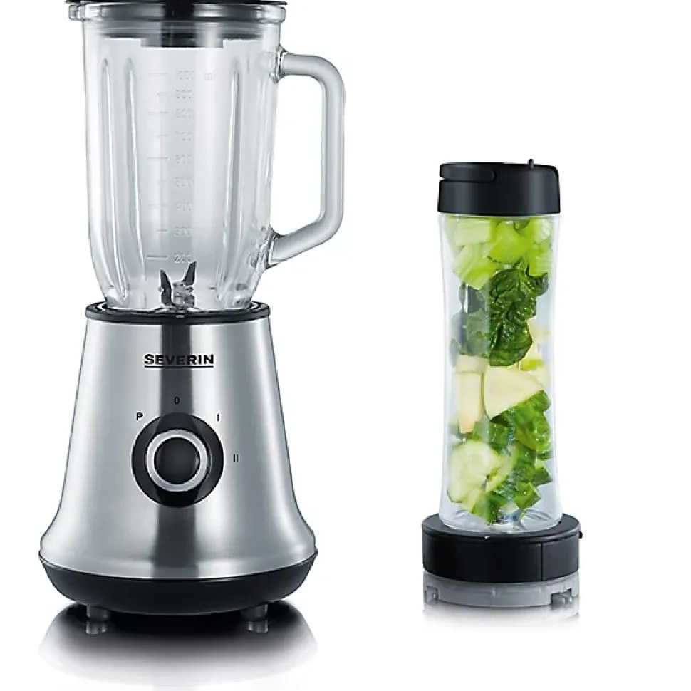 Blender 1l 500w + smoothie mix & go Severin – Le blender SM3737 de SEVERIN est puissant et robuste. Son bol en verre et ses lames en acier inoxydable de haute qualité lui permettront mixer facilement fruits et légumes.En plus d’un blender classique, le SM3737 est fourni avec le Smoothie Mix & Go qui prépare directement dans le récipient de 600ml pour que vous puissiez partir avec directement. Une fois mixer il vous suffit de visser le bouchon. – Puissance : 500 WCapacité blender: 1 LitreBol amovible en verre avec bec verseurCouvercle avec bouchon à mesures2 niveaux de vitesseFonction pulseInclus smoothie : récipient à boisson de 600 ml amovible en Tritan (sans bisphénol A) lavable au lave-vaisselleCouteau en inoxMoteur puissantCorps en inoxCoupe-circuit de sécuritéRangement de cordonVentouses anti-glisseCouleur : Inox et noir