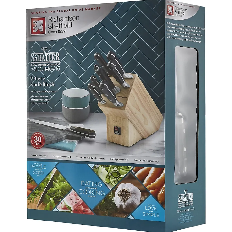 - Bloc V Sabatier Life par Richardson Sheffield contenant 1 couteau utile (85 mm), 1 couteau à éplucher, 1 couteau d’office, 1 couteau à désosser, 1 couteau de chef, 1 couteau à découper, 1 fourchette à découper, 1 couteau à pain et 1 fusil à aiguiser.