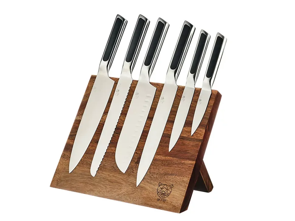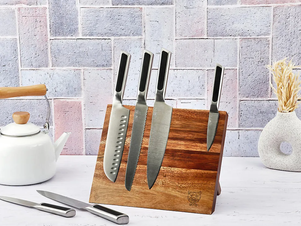 Faire le choix du bloc couteau VANTAA c’est opter pour le côté pratique & chic. Confectionné avec soin en bois d’acacia verni, il présente une apparence design et minimaliste. Il comporte de puissants aimants intégrés, créant une surface entièrement magnétique qui maintient solidement vos couteaux en place. Le support pliable à l’arrière offre une stabilité pendant l’utilisation et se replie facilement pour un rangement compact. Cette fonctionnalité vous permet de ranger facilement le bloc lorsqu’il n’est pas utilisé tout en conservant un maintien des couteaux. Le bloc magnétique VANTAA représente non seulement une solution de rangement ingénieuse, mais aussi un élément de décoration original dans le séjour ou la cuisine.Les couteaux LOKI allient fonctionnalité, durabilité et design et ont été spécialement conçus pour répondre aux besoins de tous. La combinaison des couleurs noire et métal confère à ces couteaux un aspect très chic et moderne tandis que la finition satinée des lames exprime toute la qualité d’une découpe lisse et précise. Particulièrement aiguisées, ces lames offrent une performance de coupe optimale pour émincer, trancher ou hacher. Ils sont fabriqués en acier inoxydable de haute qualité pour garantir une longue durée de vie et passer au lave-vaisselle. Les poignées des couteaux quant à elles sont à la fois résistantes et antidérapantes, permettant d’accomplir toutes vos taches culinaires avec succès. Le set rassemble les indispensables de la découpe pour réussir toutes vos préparations : le couteau d’office pour couper et peler, le couteau universel est très polyvalent, le couteau santoku pour les herbes aromatiques, les fruits et les légumes (les aliments ne restent pas collés à la lame grâce aux alvéoles), le couteau à trancher pour couper les viandes sans les déchirer, le couteau à pain permet de découper des tranches nettes sans en abîmer la croûte et le couteau du chef pour les fruits, légumes, viandes ou poissons…