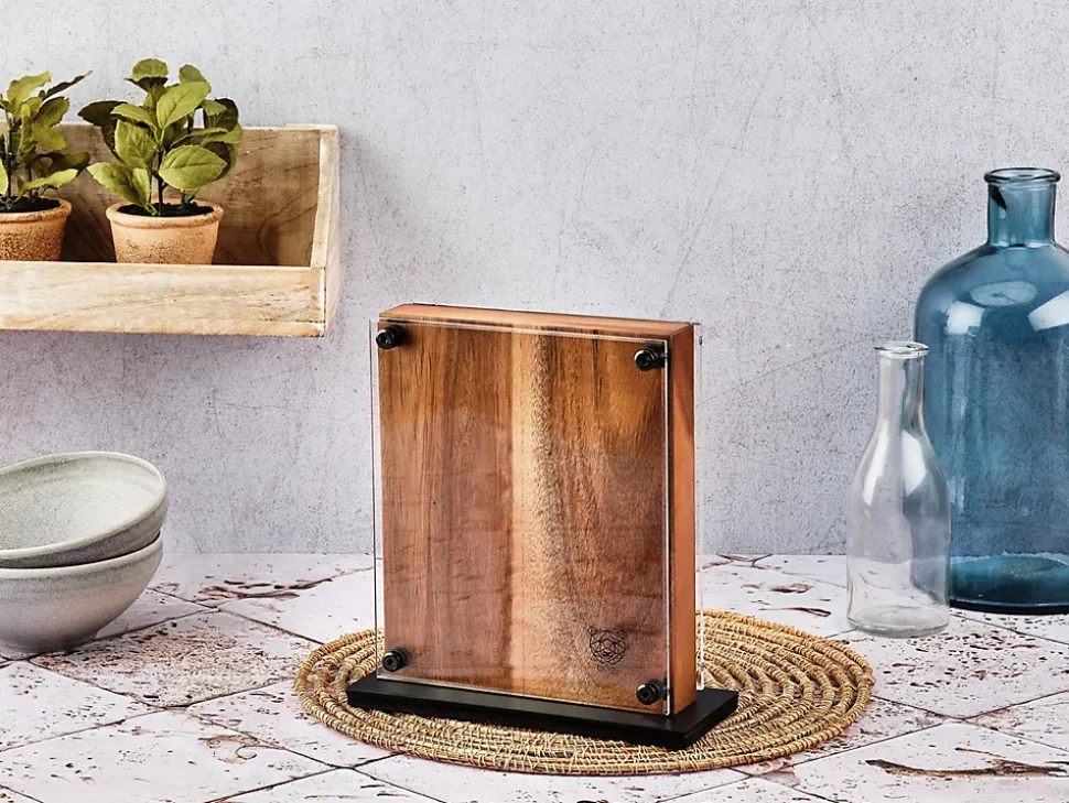 Bien plus qu’un simple accessoire pour ranger vos couteaux sans les abîmer, RAUMA deviendra une véritable pièce maîtresse dans votre cuisine. Le bloc couteaux magnétique propose une façon moderne et esthétique d’afficher vos nouvelles lames, tout en permettant un accès et un stockage faciles de vos couteaux. Avec son design épuré et naturel, le grain unique et la couleur riche du bois d’acacia apportent une touche authentique à votre cuisine. Grâce au système de fixation magnétique puissant, vos couteaux resteront solidement en place, offrant une organisation pratique tout en affichant ces éléments design dans la cuisine. Vous pourrez ainsi les admirer comme de véritables œuvres d’art à travers la vitre de protection transparente (et amovible) du bloc.
