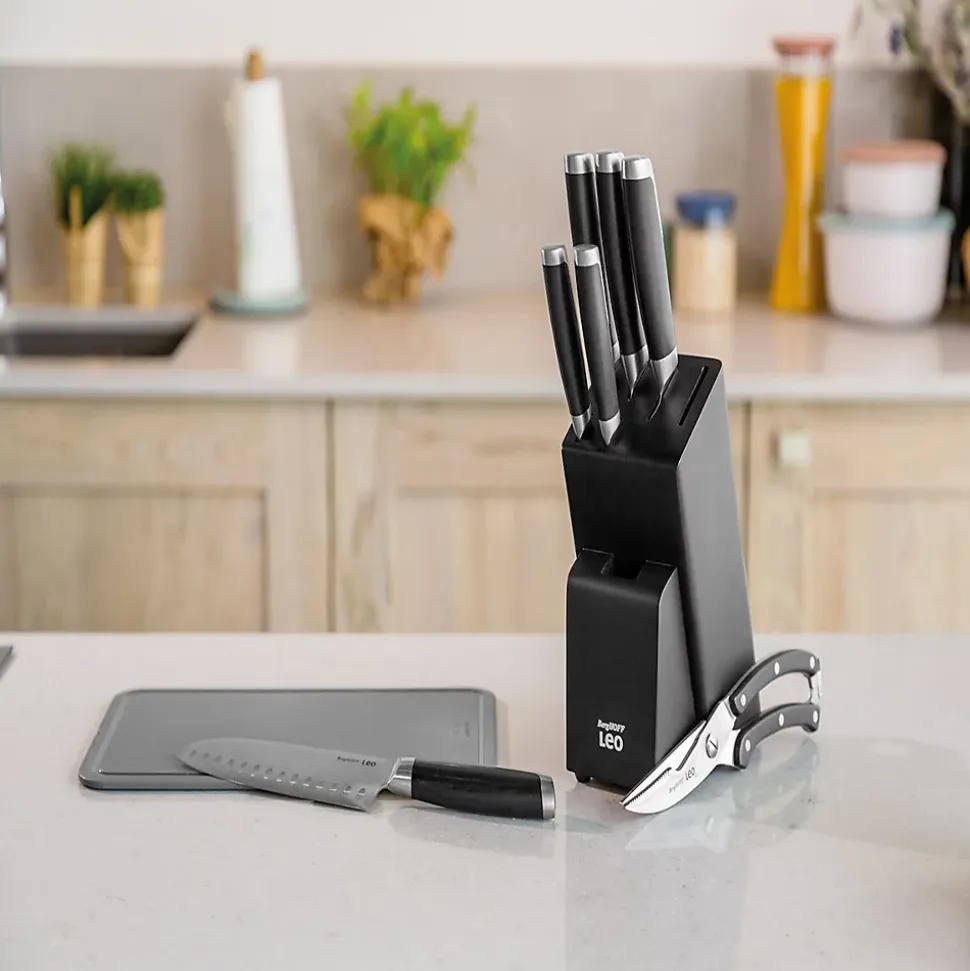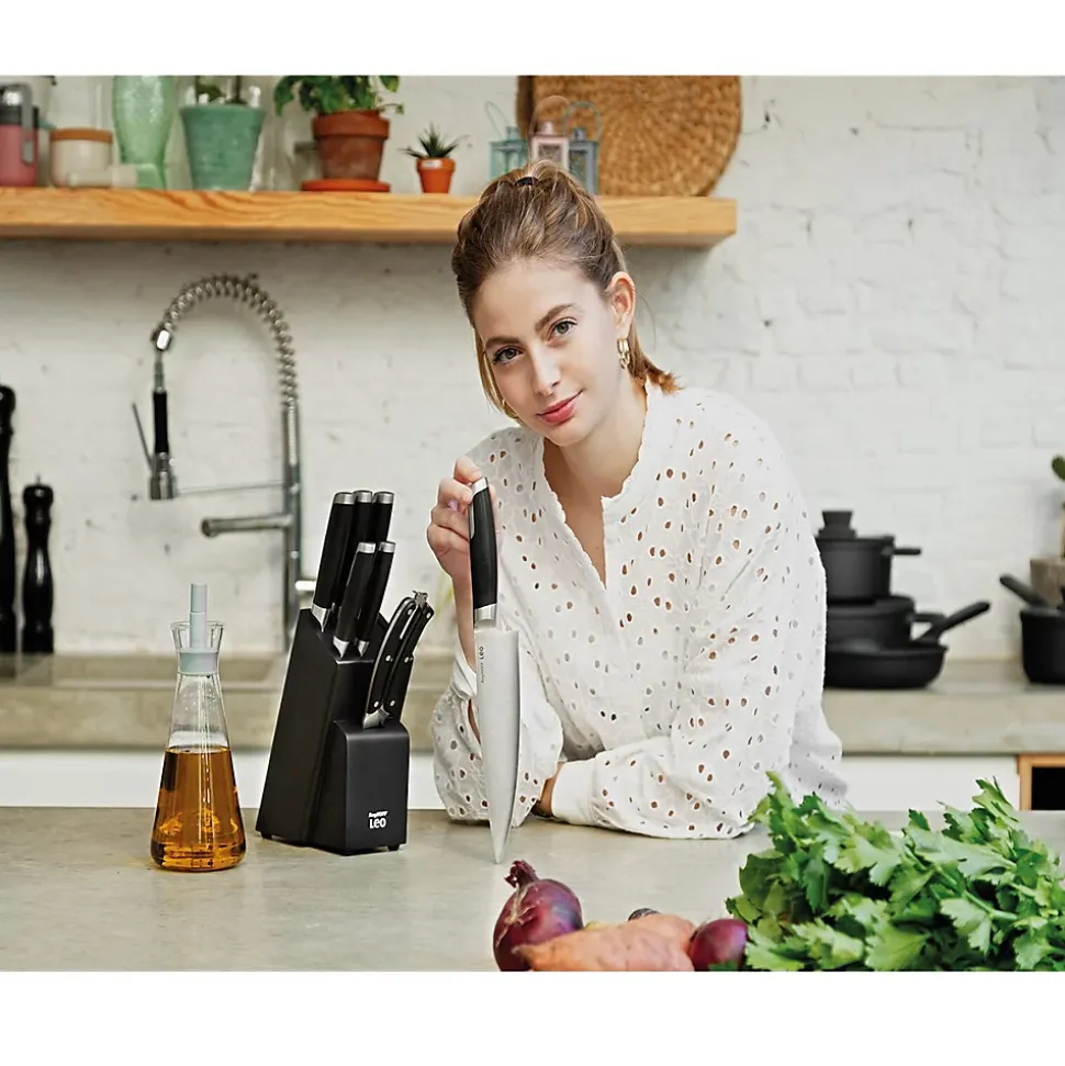 Bloc de 5 couteaux lames inox Berghoff – Vous souhaitez élargir votre collection de couteaux avec des couteaux de haute qualité au design épuré et un bloc de couteaux assorti ? Ce bloc à 5 couteaux contient des couteaux en acier chromé de haute qualité : couteau d’office, couteau utilitaire, couteau à découper, couteau à pain et couteau de chef. Dans le magnifique bloc à couteaux en bois d’hévéa noir, vous pouvez ranger tous ces couteaux de façon pratique et à portée de main pour la préparation de vos aliments. Pour que cet ensemble soit complet, nous avons prévu un espace de rangement pour le Couteau santoku et les ciseaux à volaille assortis. – Poignée ergonomique pour un contrôle optimalBase antidérapante pour plus de stabilitéUn couteau pour chaque tâche de coupeGarde vos couteaux organisés en toute sécurité et prêts à l’emploiAcier inoxydable de haute qualitéFacile à nettoyer1 x chef knife – 20,00 cm1 x bread knife – 20,00 cm1 x carving knife – 20,00 cm1 x utility knife – 12,00 cm1 x paring knife – 9,00 cm1 x knife block 23,50 x 15,00 x 10,00 cmFinition extérieure : BoisMatière du produit : Bois de caoutchoucMatière de la poignée : ABS et acier inoxydableEntretien : Lavage main recommandéAntiadhérent : NonSérie : GraphiteCollection : LeoPoids net du produit (kg) : 2.21Dimensions extérieures du produit (cm) : 17 x 9 x 22