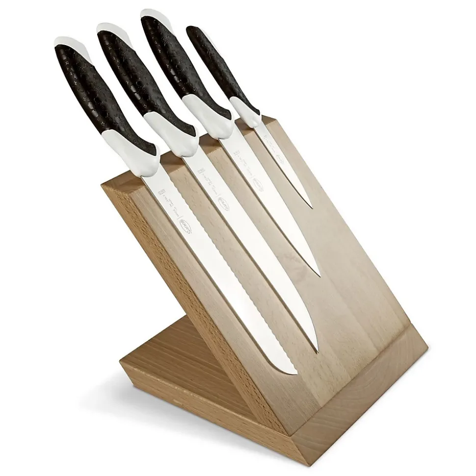 Elégant bloc à couteaux magnétique oblique à lames apparentes avec les 4 couteaux de base indispensables dans la cuisine : COUTEAU À PAIN de 23 cm à lame semi-rigide dentelée, idéal pour trancher le pain, les gâteaux et les pizzas ; COUTEAU À RÔTIR de 23 cm à lame semi-rigide, idéal pour trancher les viandes cuites (par ex. rôtis, viandes bouillies) ; COUTEAU À RÔTIR de 23 cm à lame semi-rigide, idéal pour trancher les viandes cuites (par ex.) rôtis, viandes bouillies) ; COUTEAU DE CUISINE de 18 cm à lame rigide, idéal pour couper et éplucher les fruits et les légumes ; SPELUCCHINO de 11 cm à lame semi-rigide, idéal pour couper et éplucher les fruits et les légumes. Poignée ergonomique doublement moulée, petite et maniable. Agréablement conçu avec une texture rappelant la fleur de cerisier (Sakura) et doté d’une fonction antidérapante.. Ce set de couteaux de cuisine représente l’essence même de la qualité et de la praticité, offrant tout ce dont vous avez besoin pour exprimer au mieux votre art culinaire. Chaque pièce de cet ensemble a été soigneusement sélectionnée pour garantir la polyvalence, la durabilité et la précision de la coupe. | Collection: Sakura 12 | Couleur: Noir, Blanc | Matériel: Acier Inoxydable, PP | Ensemble: 5 | Dimensions du Produit: L34xP31xA13 cm | Poids du Produit (Kg): 2,10 | Poids Supporté (Kg): – | Dimensions de Boîtes: W34xD31xH13 cm | Poids de Boîtes (Kg): 2,34 | Nombres de Boîtes: 1