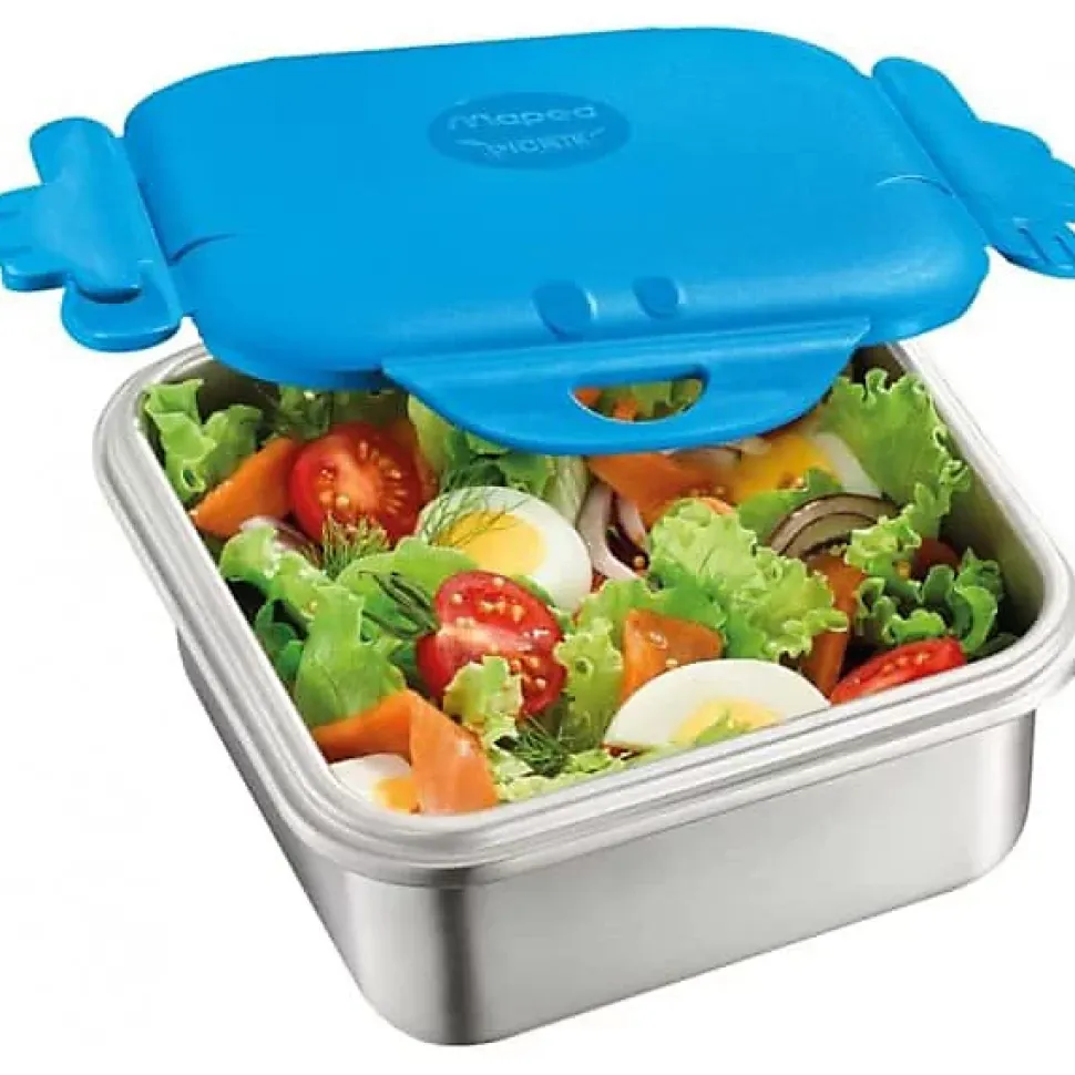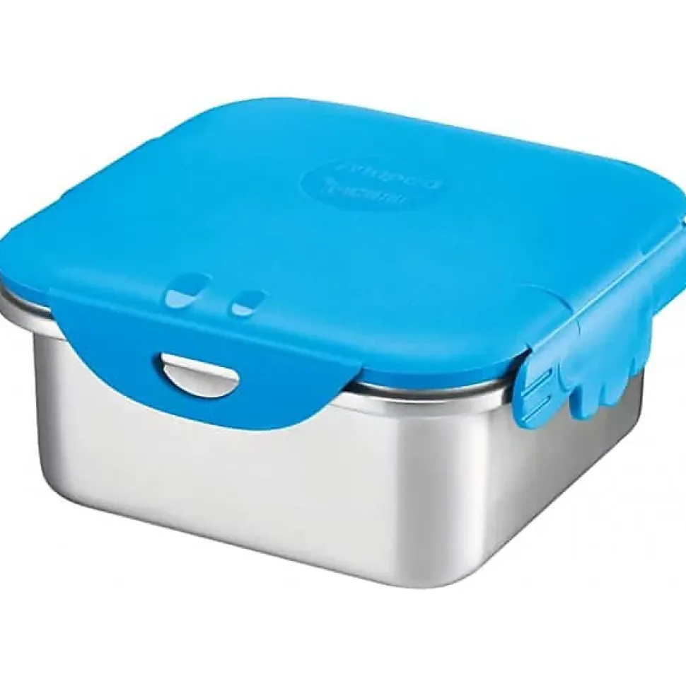 Boîte à déjeuner en inox, de capacité 1 litre.Couvercle bleu à base de plastique recyclé à 50%, boite en acier inoxydable.Lavable au lave-vaisselle, 100% étanche, coins arrondis, avec clips de fermeture de chaque côté.Dimensions: (L)16 x (T)16 x (H)7,5 cm