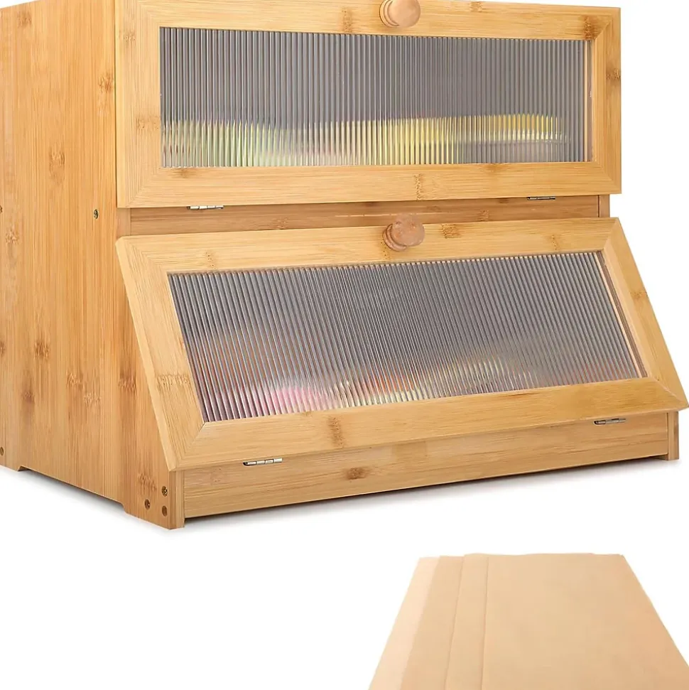 Gardez le pain frais : contrairement aux récipients hermétiques qui sèchent rapidement et rassis le pain, notre boîte à pain retient juste assez d’humidité et permet la circulation de l’air, pour garder la fraîcheur pendant de plus longues périodes.Grande capacité + papier à pain : notre boite pain à 2 couches est suffisamment grande pour contenir 2 grandes miches de pain, petits pains, muffins et plus encore, ce qui évitera efficacement la déformation du pain causée par l’extrusion. Il est également livré avec 50 feuilles de papier à pain pour faciliter le stockage du pain. Cette paniere a pain en bambou naturel est idéale pour les familles nombreuses.Conception de base surélevée : l’espace entre le comptoir et le fond de la huche à pain en bois peut garder les boîtes à pain loin de l’eau pour garantir que le pain reste frais plus longtemps.Fenêtre en acrylique givré : la fenêtre en acrylique givré de la rangement pain en bambou peut vous aider à observer la quantité restante de votre pain, tout en accordant plus d’attention à la protection de votre vie privée. La niche a pain en bambou est dotée d’un verrou magnétique puissant, dont la conception unique maintient le pain propre et frais.