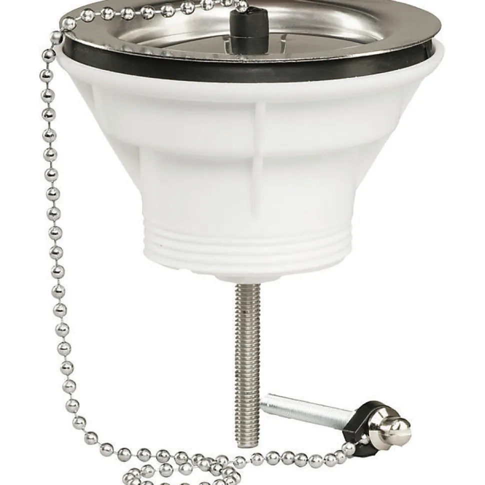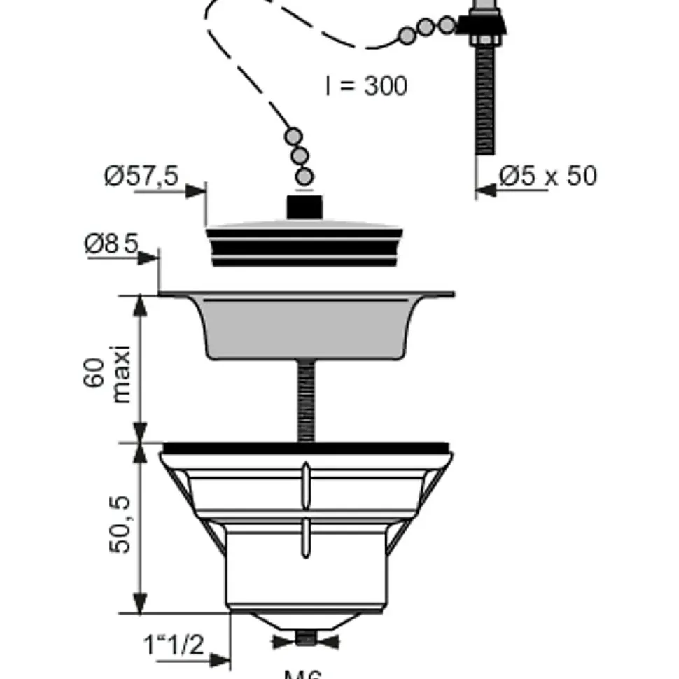 Bonde évier diam. 60 mm à bouchon avec enjoliveur inox diam. 57,5 mmCuvette inox diam. 85 mmSerrage 0 à 60 mmVis inox M6 x 80Débit : 55 l/mnH. sous évier 50,5 mm