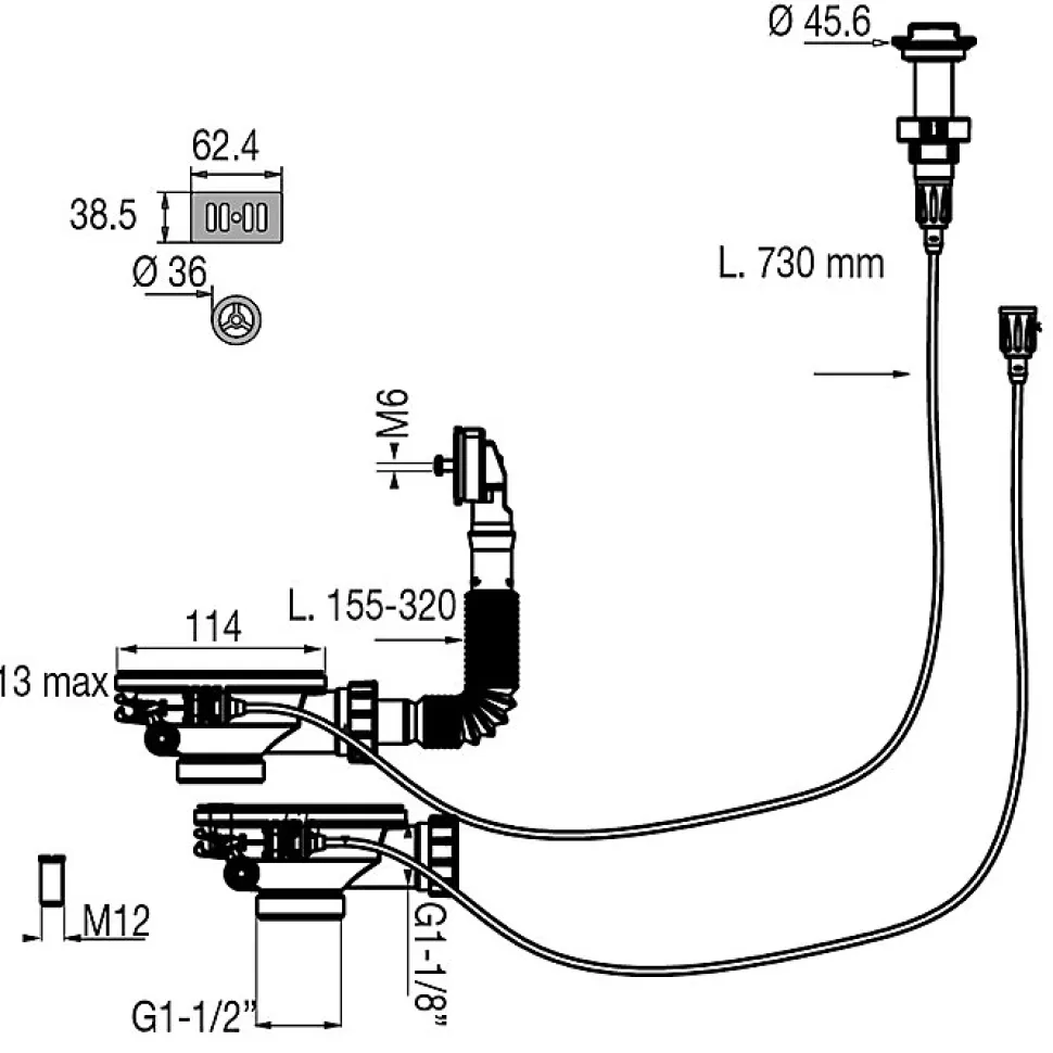 Bonde à panier automatique à câblePour évier 2 cuves Diamètre perçage 90 mmHauteur sous évier 65 mmTrop-plein extensible longueur 155 à 320 mmGrilles de trop-plein rectangulaire et ronde