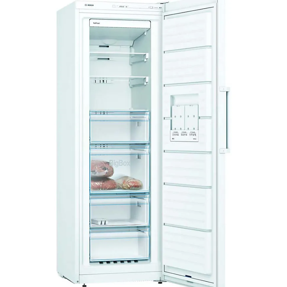 Congélateur armoire Bosch 225L No Frost avec technologie Multi Airflow pour une conservation optimale, fonction SuperFrost pour congélation rapide, système No Frost pour éviter le dégivrage manuel, alarme porte ouverte et affichage LED, classe énergétique E, faible niveau sonore de 39 dB, autonomie de 25h en cas de coupure électrique, design compact blanc avec dimensions 60x65x176 cm.