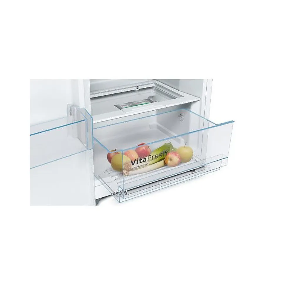 Réfrigérateur 1 porte Tout utile – Ligne série 4 – Dégivrage automatique – Froid brassé PowerVentilation – Fonction Super Réfrigération avec arrêt automatique – Clayette porte-bouteilles – Clayettes verre – EasyAccess : clayette en verre rétractable pour faciliter le chargement et le déchargement – Compartiment VitaFresh avec contrôle d’humidité : les fruits et légumes restent frais et riches en vitamines plus longtemps – Eclairage LED – Régulation électronique FreshSense avec affichage LED : température constante par technologie de capteurs intelligents – Ouverture de porte sans débord à 90° – Poignée verticale.Code EAN : 4242005205714Volume net (total) : 324 LType de froid : brasséVolume net (réf.) : 324 LDistributeur d’eau : sansNombre de compresseurs : 1Nombre de circuits : 1Régulation : électroniqueAffichage T° : ouiAlarme : nonDistributeur d’eau : nonOuverture facile : SansPorte(s) réversible(s) : ouiNiveau sonore : 39 dBConso élec : 110 kWh/anClasse climatique : SN-TConnecté : nonLABELSLabel énergie : A++Le + produit : Bac à légumes VitaFreshDisponibilité des pièces détachées : 11 ans (donnée constructeur)Dimensions (LxHxP) : 60 x 176 x 65 cmPoids net : 67,1 KgColoris : blancLieu de fabrication : Pologne
